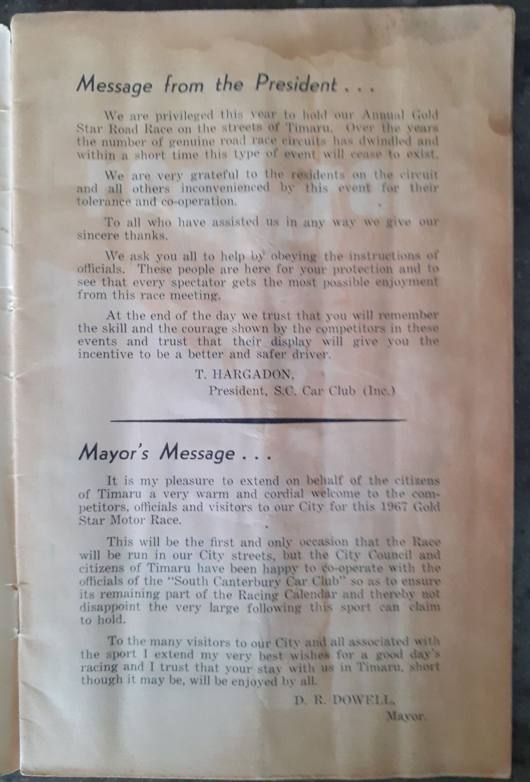T Hargadon - The President of the South Canterbury Car Club, ( Inc ), message along with one from D R Dowell the local City Council Mayor.