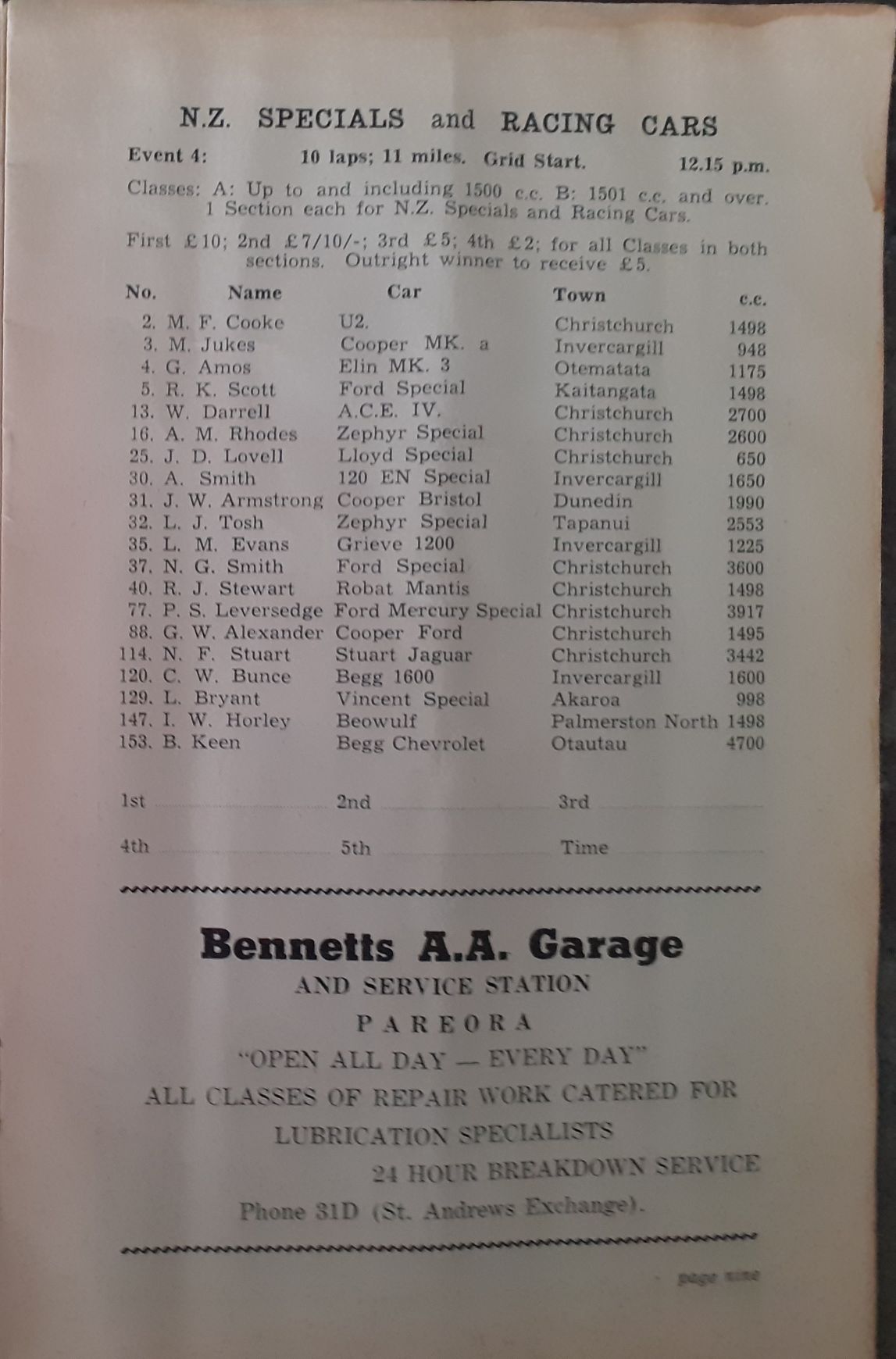 Event 4 - N.Z. Specials and Racing Cars - 2 Classes - up to 1500cc and over, with a Section for each NZ Specials and Racing Cars.