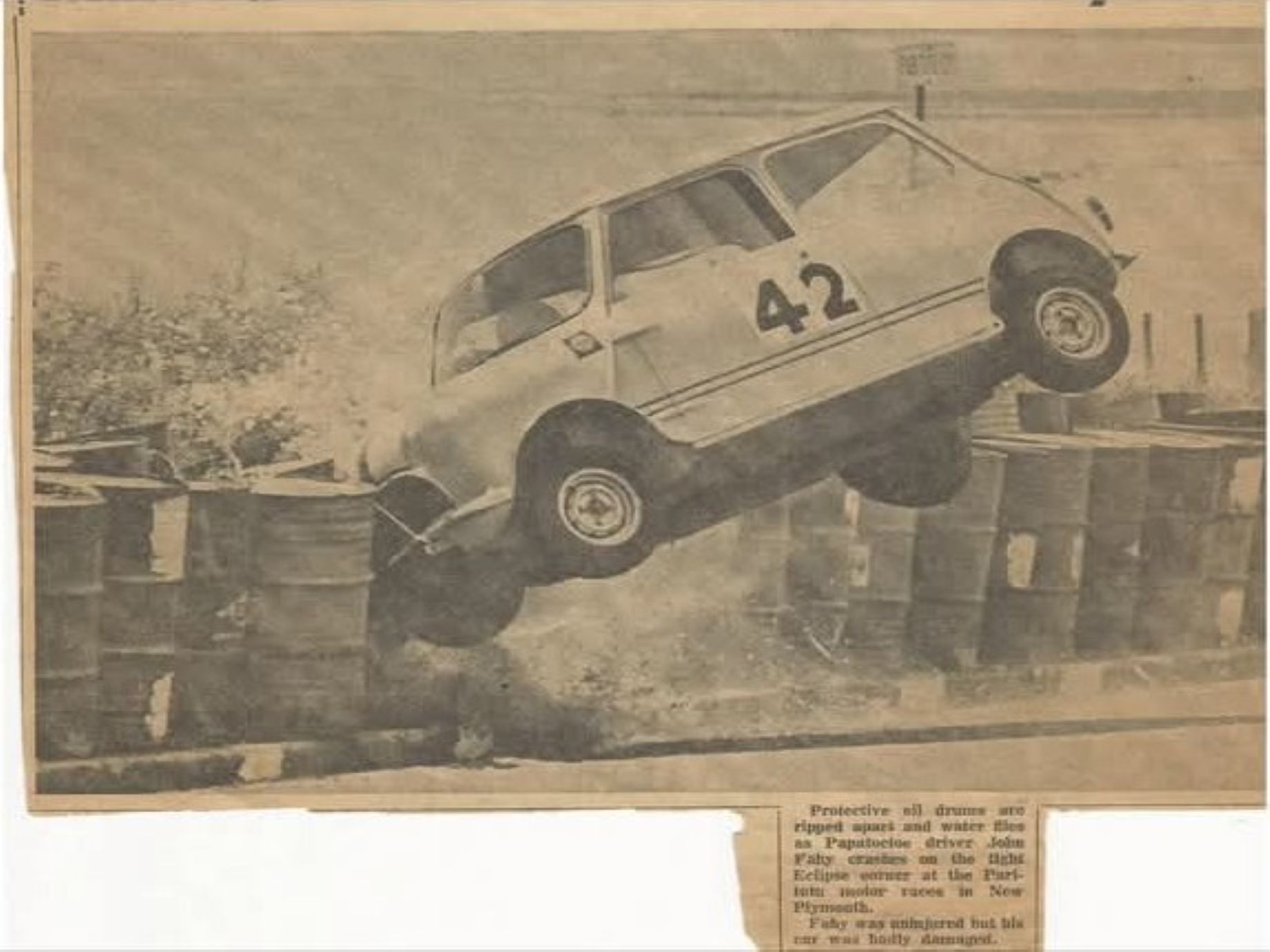 " PARITUTU: Pt. 4 I found the Race Program, which confirms the races were on Labour Weekend 1965 .. The track layout is shown, after the Start a long uphill drag to cnr 1 L/H right angle, up a steep rise to crest, flat to cnr 2 L/H R/A, flat to L/H curve, down to 2nd curve, which then dropped steeply to cnr 5 which had a dicey camber and a big drop off on the R/H side lined with water filled 44 gal. drums, then a short up hill run to the finish .. Simple enough you say, but tricky, and took its toll on many a car. "