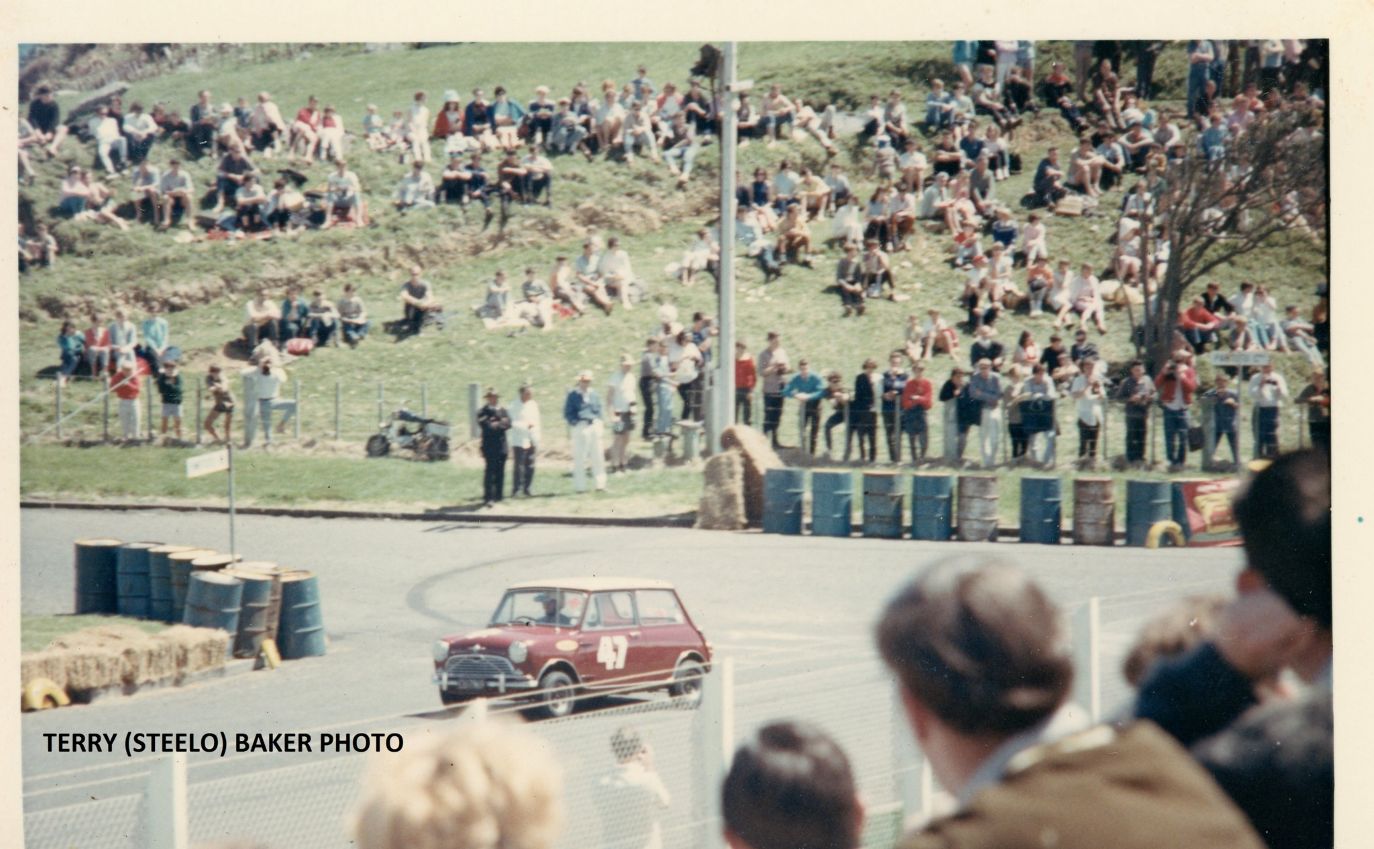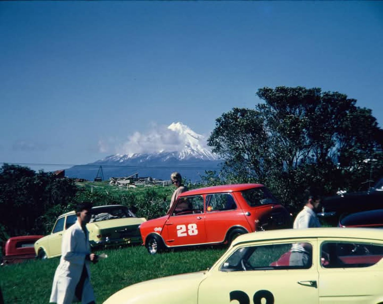 Alan Boyle and Ron Brown Minis with other cars at the Pit area - beside Paritutu Rock - Mountain.
