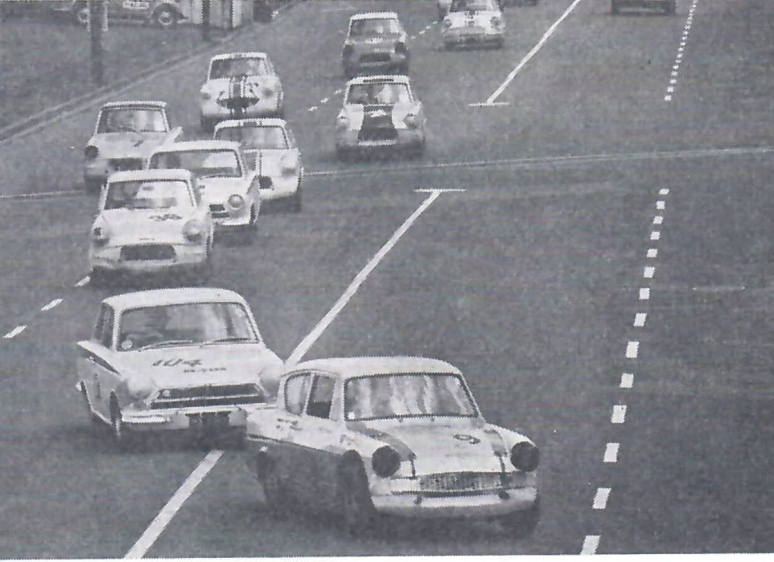" PARITUTU : Pt. 5 (1965) As seen in previous Pts 1-4 (on my FB page) My great pal Ron Brown and I entered this inaugural Race Meeting as Auckland Car Club members.. Ron's Mini he had built into a 1275s and had done a few meetings at Pukekohe and Levin.. The line up at Paritutu shows some names which will become well known in future years.. Ron is holding off a push by 2 Cortinas, #74 Lotus- R. Ray Wilson (Auck.) and a dark one either, N. Neville A. Crighton,GT ( Matamata) or T. Tom Grace GT (Helensville) "