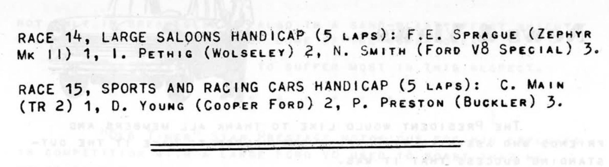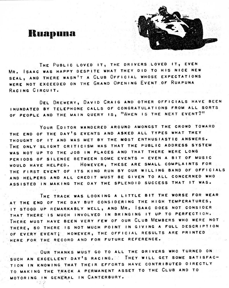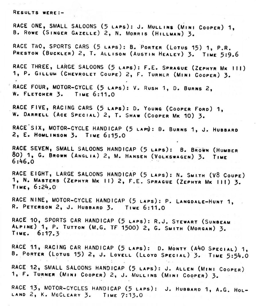 Events were organised by the " Motor Racing Club Inc " which also ran the Southbridge events.