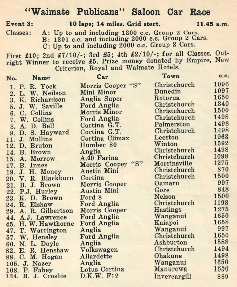 1965 The Publicans Saloon Car Race - sponsored by 4 Pubs - their Publicans - The Empire, New Criterion, Royal and Waimate Hotels...
