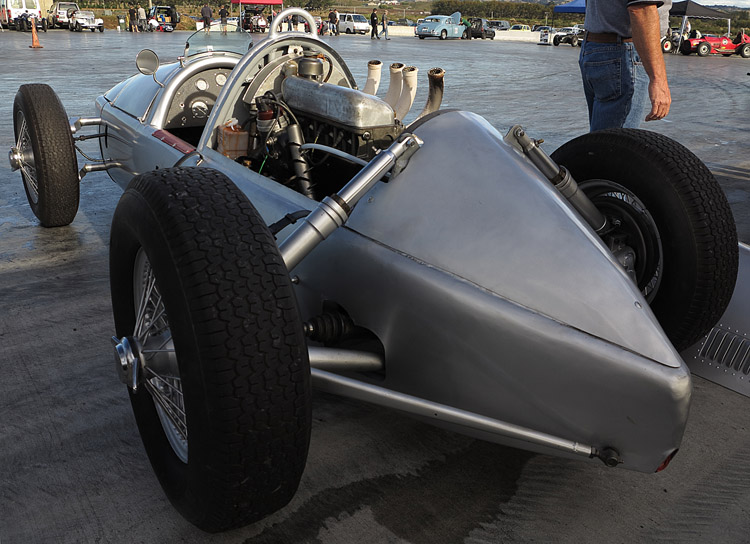 The engine was a standard vanguard wet linered engine with a few minor modifications, larger head studs, cross drilled crankshaft, and a Hec Green designed and ground cam shaft. Fed by a pair of SU carburetors through an aircraft cabin blower chain driven from the front of the crankshaft to provide 14 pounds of boost. Fuel was an methanol blend. Transmission was originally Citroen, but this caused repeated problems with the horsepower and torque of the blown engine and was eventually replaced by a 3 speed transaxle of their own design and manufacture. This proved well up to the task and is still in the car today.