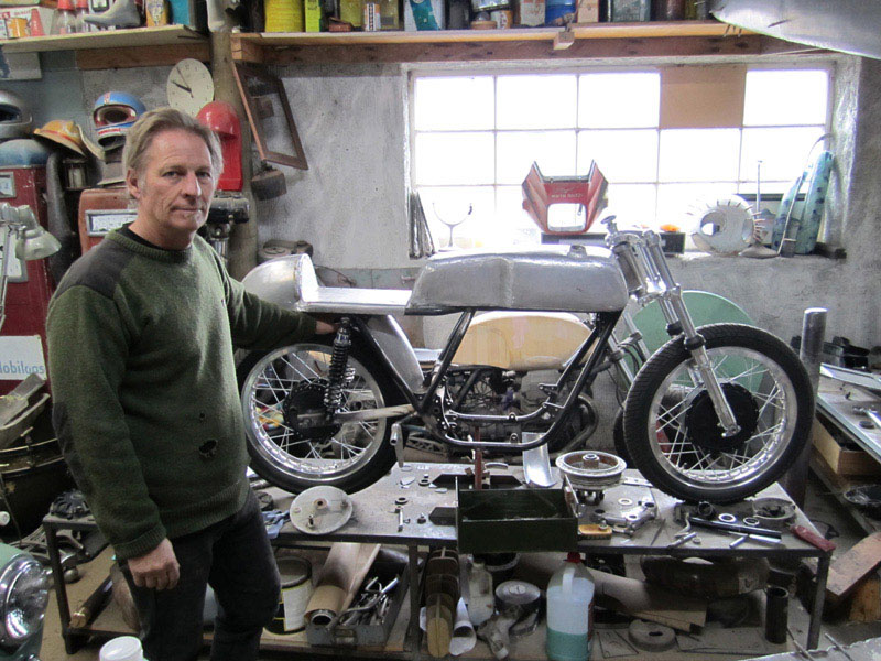 He is a petrolhead, and has been riding motorbikes since he was a kid. His motorbike collection is made up of several Moto Guzzi's, including the 1972 classic race bike pictured here which he is restoring. He also owns and is restoring a Steve Roberts Suzuki TR250 that was raced by Geoff Perry in the early '70s.