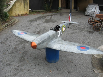 A few months back Brett decided he wanted to make a large scale model Spitfire aeroplane. He created the framework from steel rod, shaping each piece until it was right, then welding each piece together, before then covering it in tin sheet. He then painted it to make it look weathered.