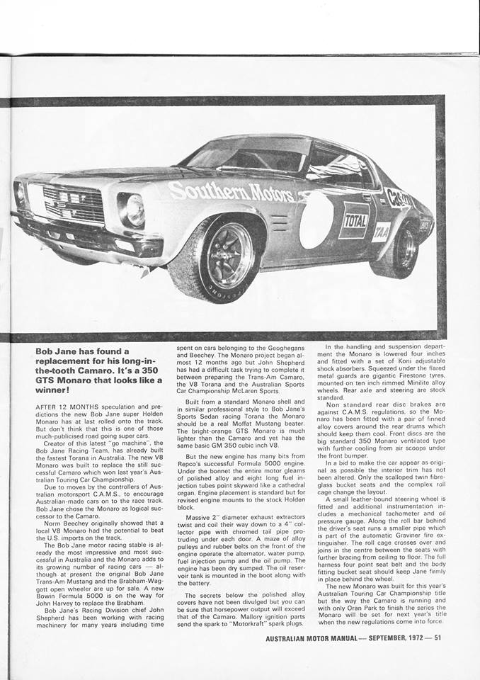 Folks, can anyone help with this? I'm after period magazine articles on Bob Jane's HQ Monaro, particularly in its original Improved Production guise, as raced in 1972 in the Australian Touring Car Championship.