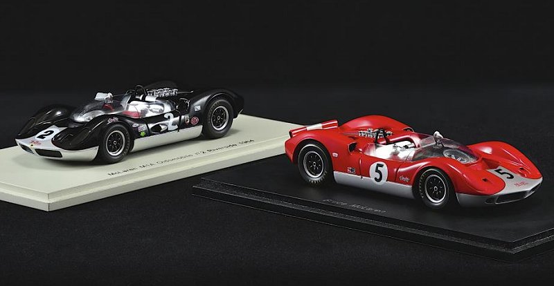 This first image shows Spark S1103 displayed with Spark S1101 (Bruce's black/silver McLaren M1A #2 as raced at Riverside in 1964).
