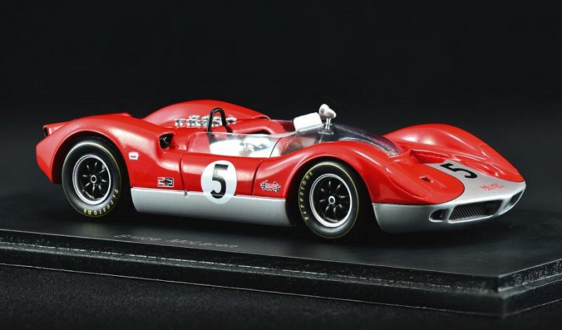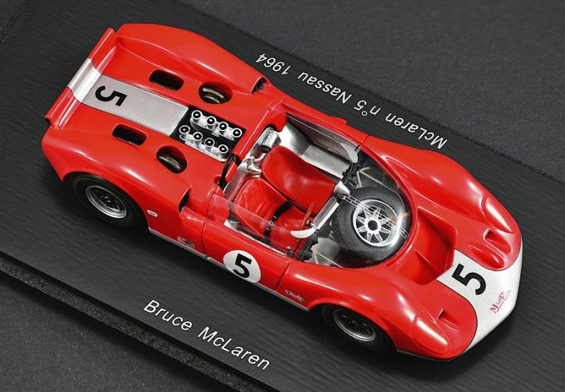 This one is a 1:43rd resin model of the #5 McLaren Elva as raced by Bruce McLaren in the 1964 Nassau Trophy race in the Bahamas. Bruce finished 2nd in the rain-affected, 250 mile race, behind the Chaparral 2A of Roger Penske. The McLaren was powered by a 4500cc Traco Oldsmobile V8.