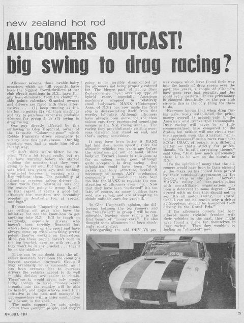 The Custaxie, a mid-1950s Ford Customline fitted with a 427ci Ford Galaxie motor, and which featured heavily modified body, suspension, and chassis work, made its racing debut in late 1966, for the 1966/67 New Zealand Saloon Car Championship, which was the last held under the outgoing Allcomer rules.