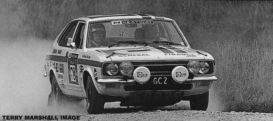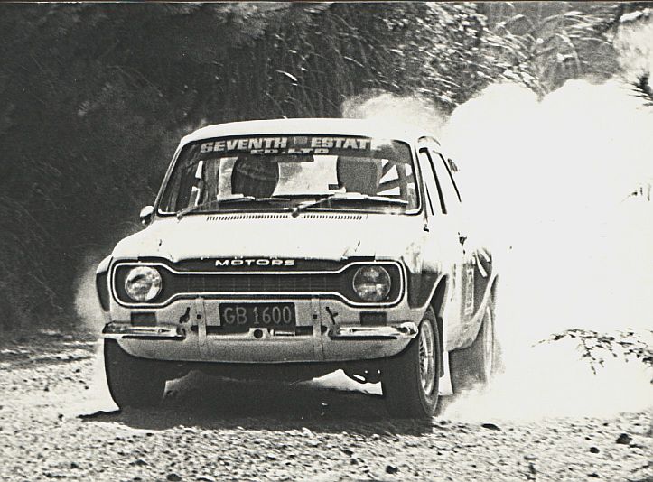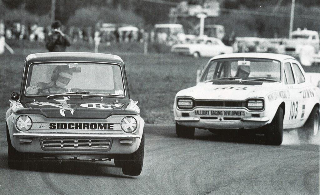 Jim Richards in the Imp working hard ahead of the Escort of Don Halliday. (Possibly at Baypark ) Perhaps Halliday is working harder !