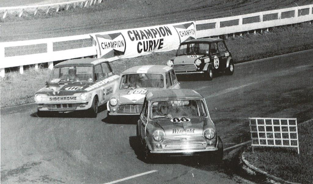Entering the Elbow Corner at Pukekohe battling with the Minis of Barry Phillips, Reg Cook and Rod Collingwood.
