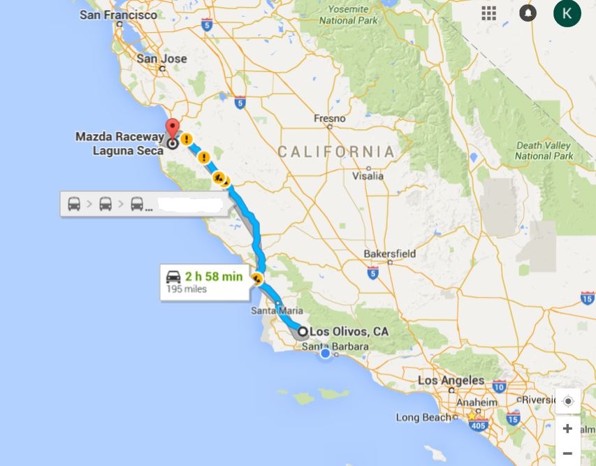 Los Olivos is almost exactly 1/2 way from LAX to Laguna Seca raceway time wise.