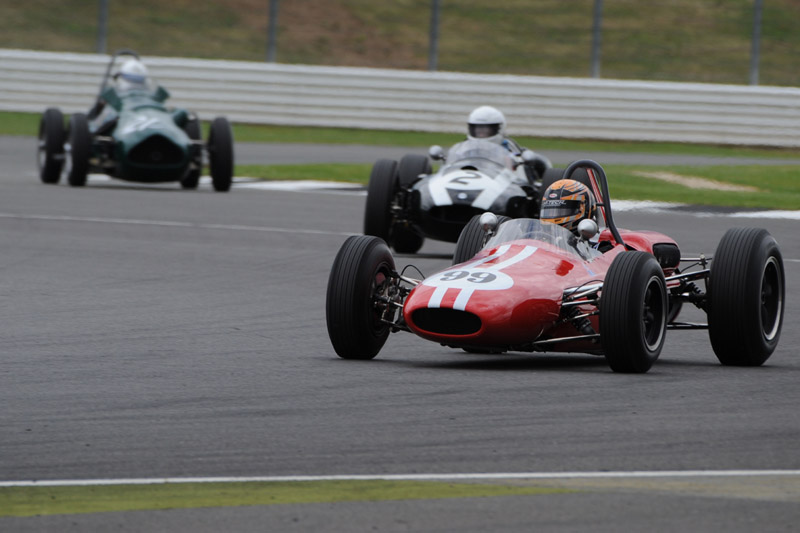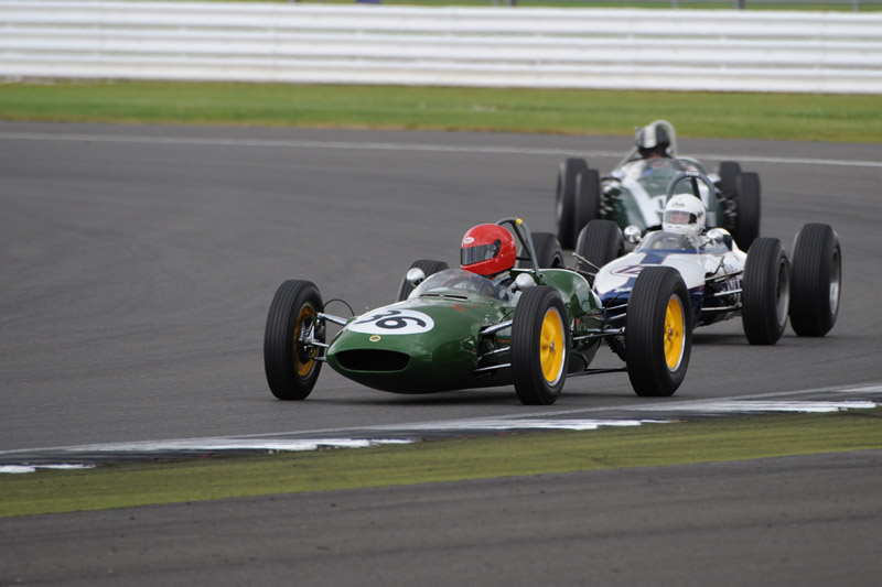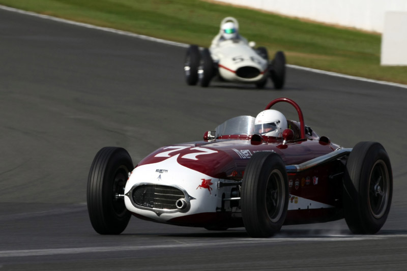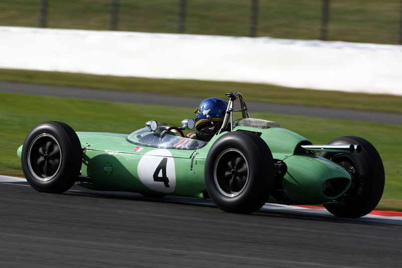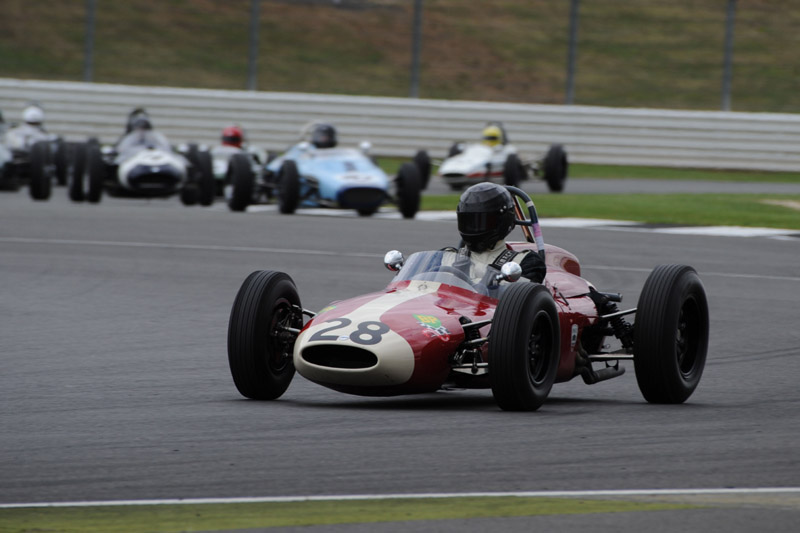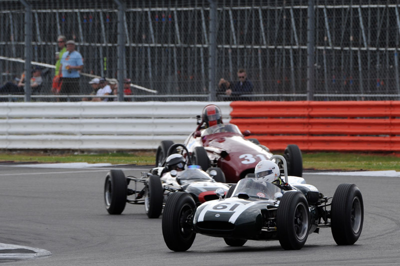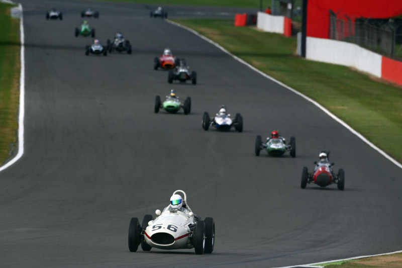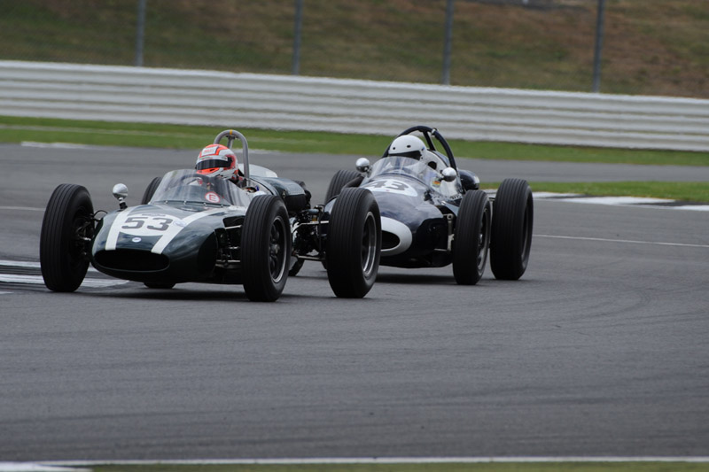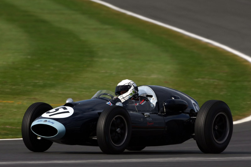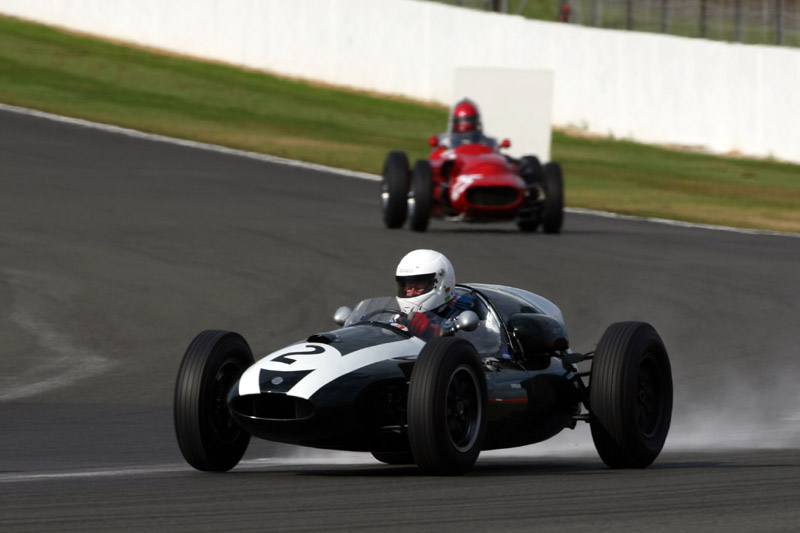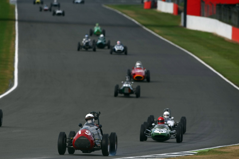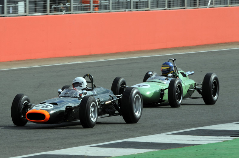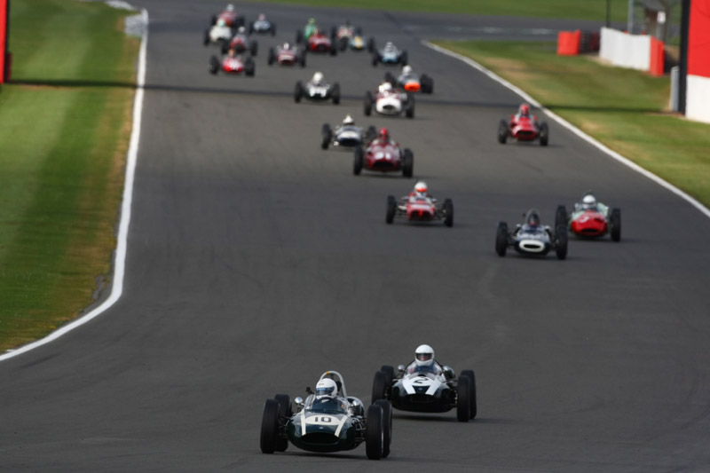 48 fantastic Grand Prix cars dating between 1937 and 1964 took the flag at the start of this race, with third-placed qualifier Jon Fairley leading as the field went through Abbey. Pole-sitter Will Nuthall soon put the Brabham BT11 under pressure, his older 1960 Cooper T53 harrying the 1964 machine.