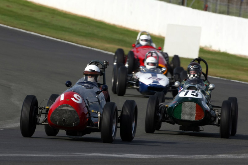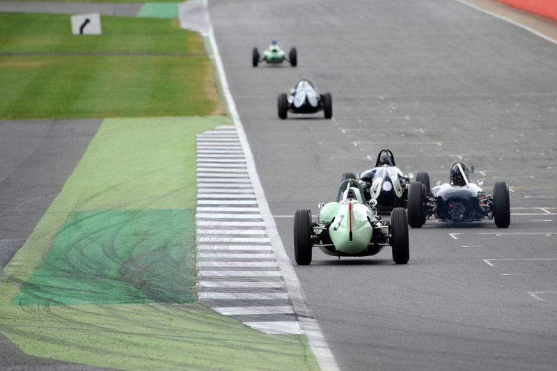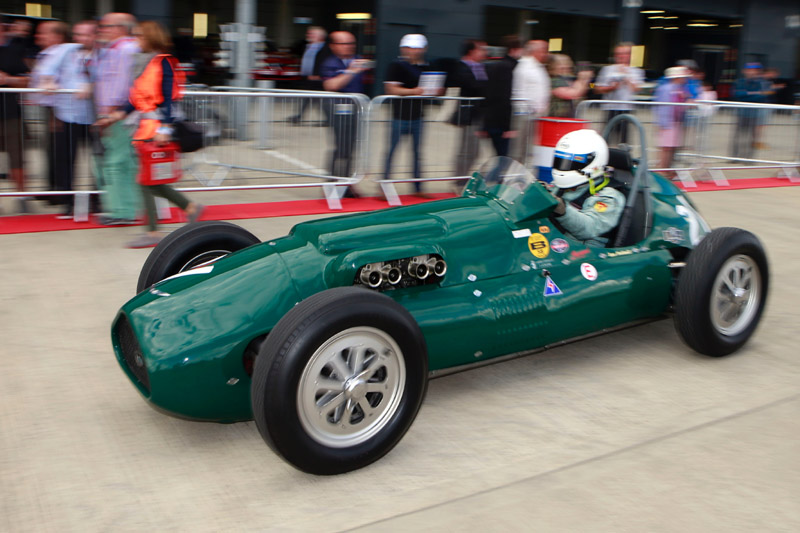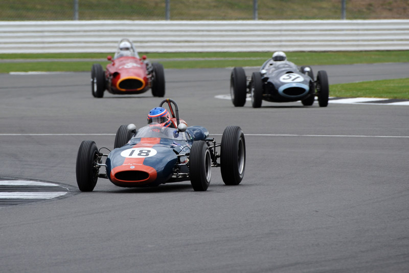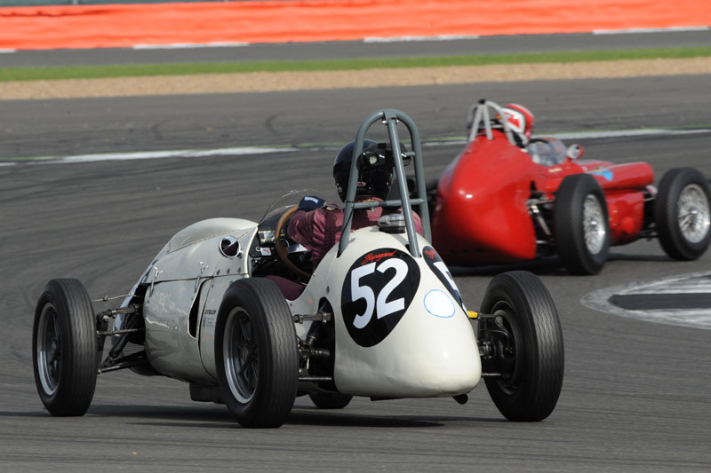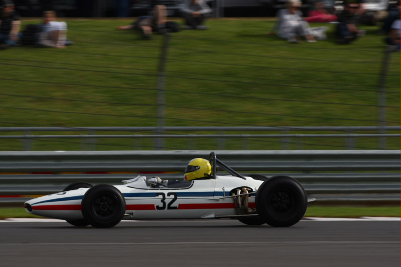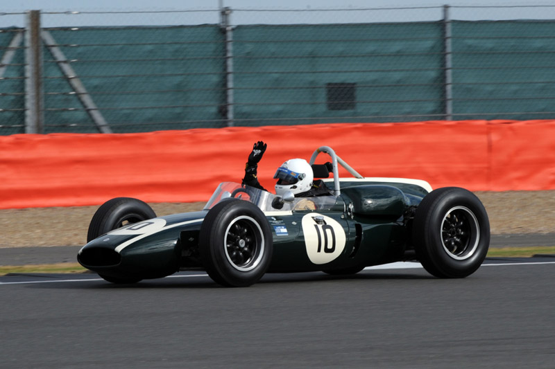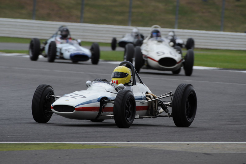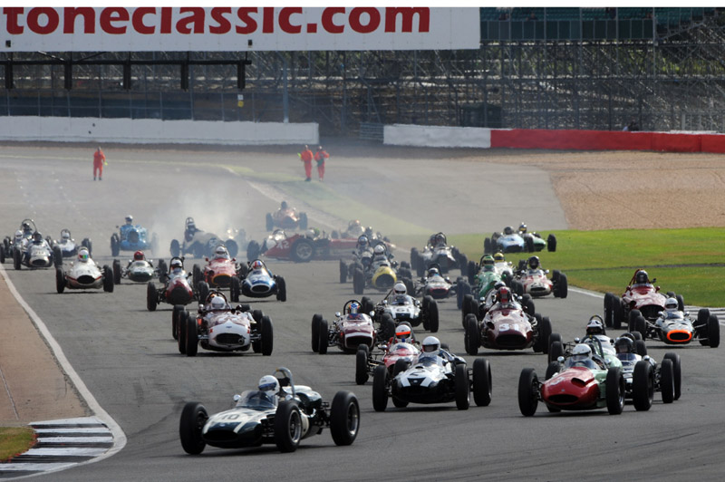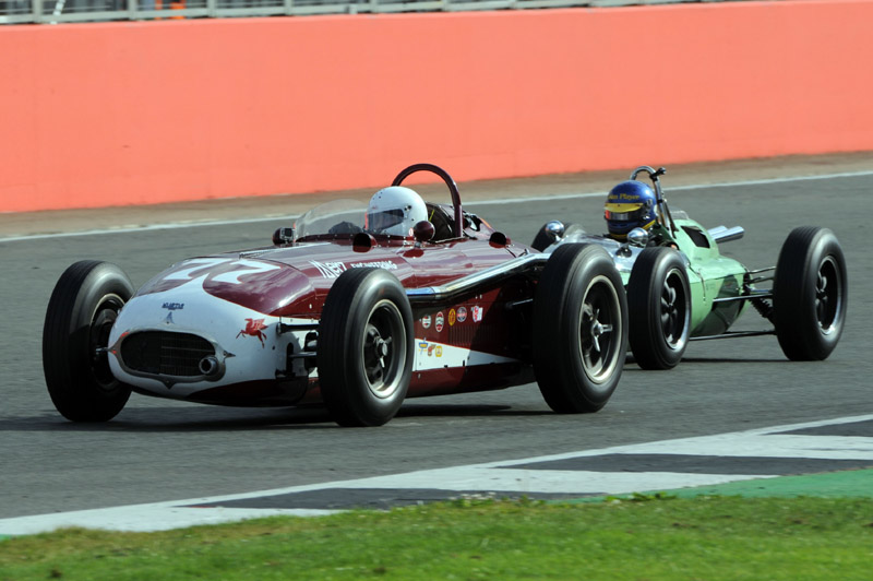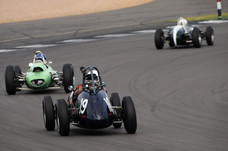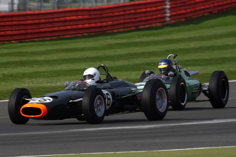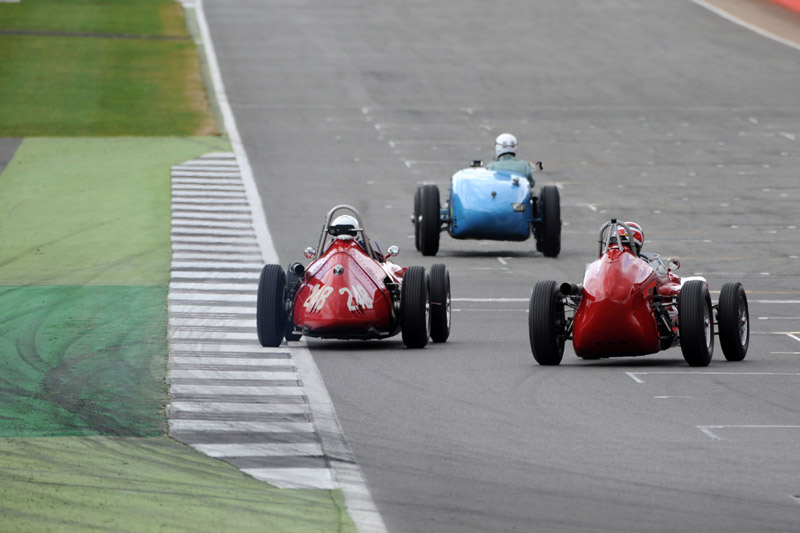 48 fantastic Grand Prix cars dating between 1937 and 1964 took the flag at the start of this race, with third-placed qualifier Jon Fairley leading as the field went through Abbey. Pole-sitter Will Nuthall soon put the Brabham BT11 under pressure, his older 1960 Cooper T53 harrying the 1964 machine.