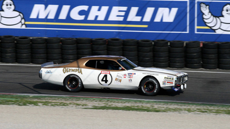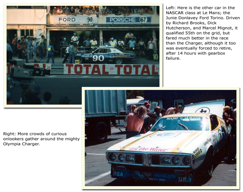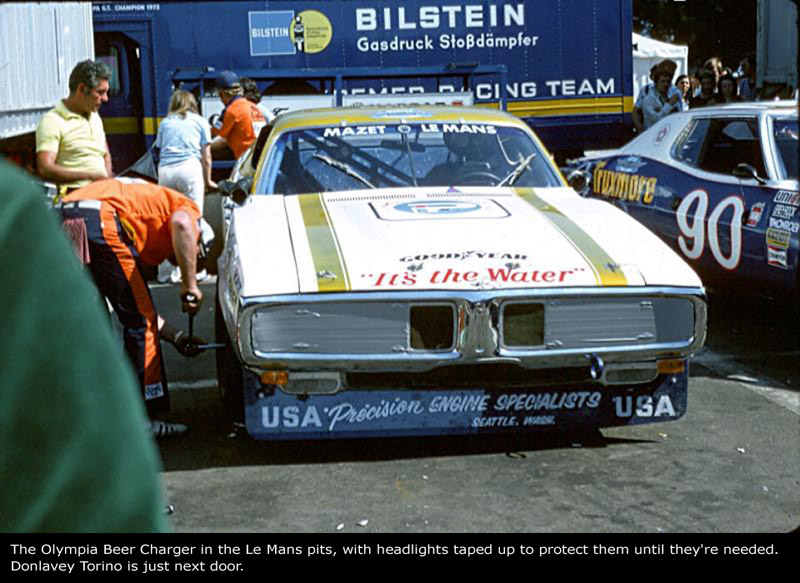 The second new class for the 1976 Le Mans race, was called NASCAR, but was essentially IMSA Grand International. And in it were two entries. One was a Ford Torino entered by Junie Donlavey, driven by Dick Hutcherson, Richard Brooks, and Frenchman Marcel Mignot, with sponsorship from Truxmore. The second entry was a Dodge Charger, entered by Hershel McGriff, and driven by Hershel and his son Doug. It was sponsored by Olympia Beer.