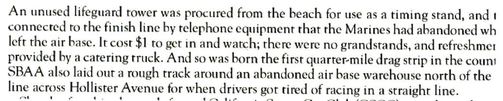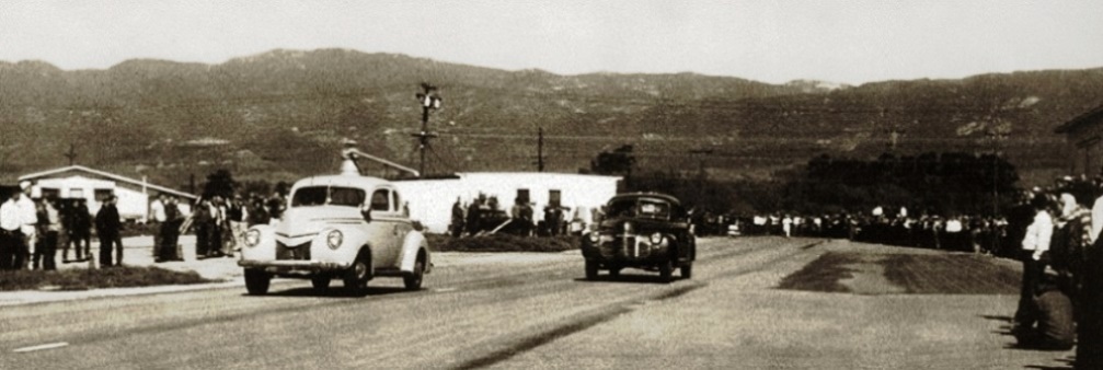 On April 10, 1949, the Santa Barbara Acceleration Association arranged a legal drag racing event at the Goleta airstrip. Up to that time, drag racing was a highly illegal pass-time, with races taking place on public roads, and hot rodders widely viewed as little short of outlaw gang members. The very first race that took place at that event was a grudge match between Tom Cobbs in a supercharged flathead V8 powered Model A coupe, against Fran Hernandez in a 296 cu.in Mercury flathead powered ’32 Ford. Hernandez won comfortably. This is widely considered to be the very first organized legal drag race.