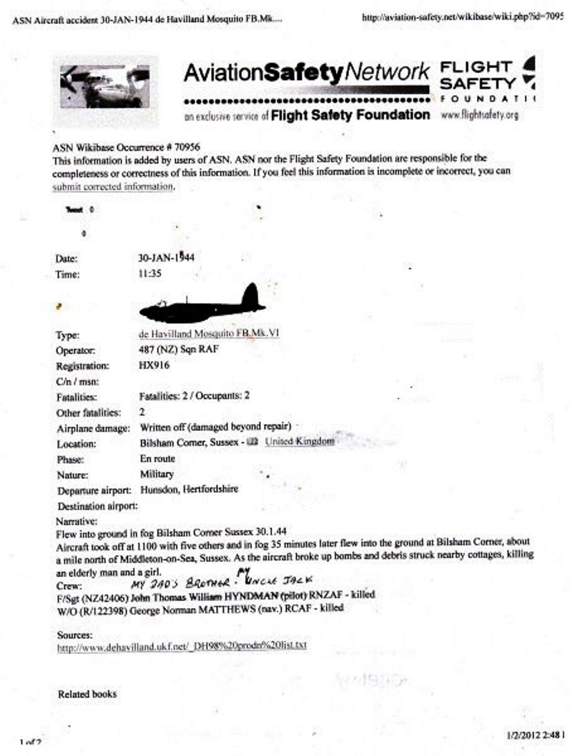 Uncle Jack was part of the RNZAF Squadron 487 and they flew under the radar known as "Hedge Hopping". Sadly as he flew in fog on a mission a few days before the big raid he happened to hit the power lines that cross the South Downs near Goodwood and although he tried to make it to the English Channel the plane crashed a mile short of the coast and sadly people on the ground were also killed. We were always told he had crashed in fog in south England but we never had any details until the last few years.