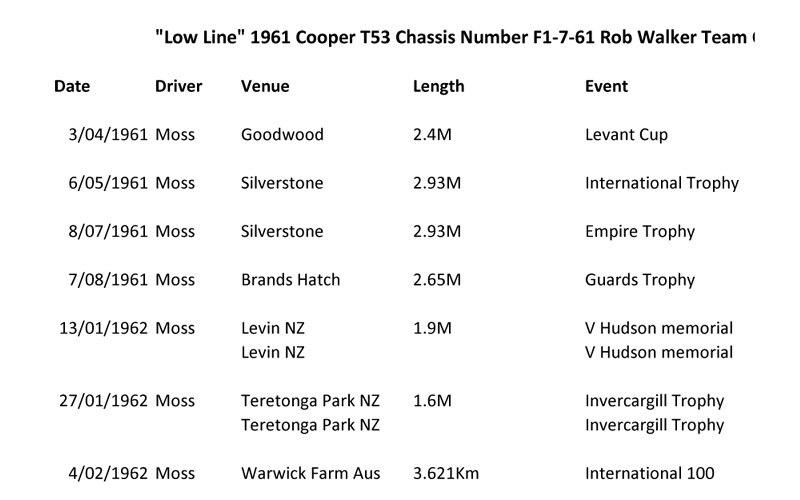 Folks, I've had a request from my good friend David Evans in England. His close friend and well known UK historic racer Nick Topliss recently purchased the Rob Walker 1961 Cooper T53 raced by Stirling Moss, chassis F1-7-61. The car has been in a museum in Laguna Seca for many years.