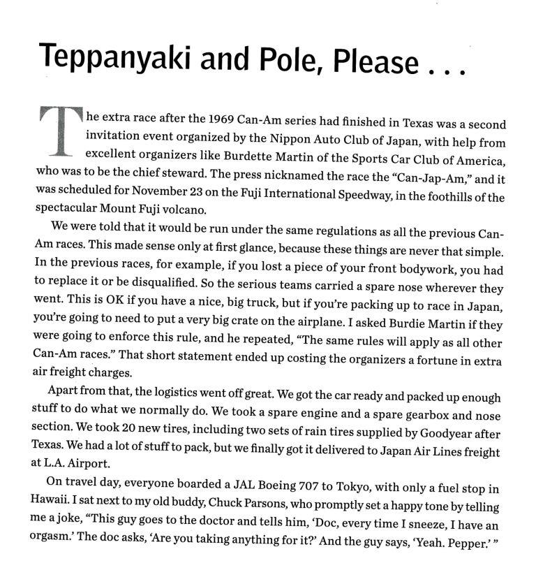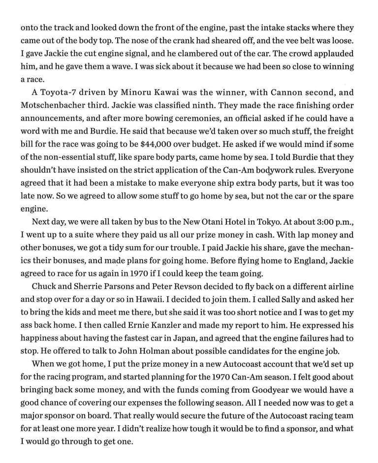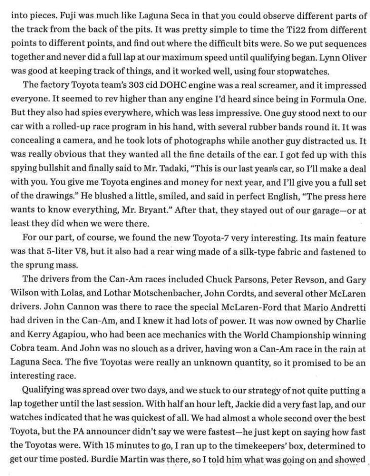 As if to underline its rapid development, the fastest Toyota in qualifying was that driven by Minoru Kawai. He was third, ahead of Revson, Cannon, and Parsons, while Oliver took pole in the Ti22. The Ti22 appeared late in the 1969 Can-Am championship, but quickly proved a serious rival for the dominant McLaren team. Impressively, second fastest at Mt Fuji was the Toyota/McLaren M12, driven by Hiroshi Fushida, just 2-tenths slower than Oliver. Come the race, Kawai won, from Cannon and Motschenbacher, after the Ti22 dropped out.