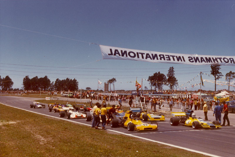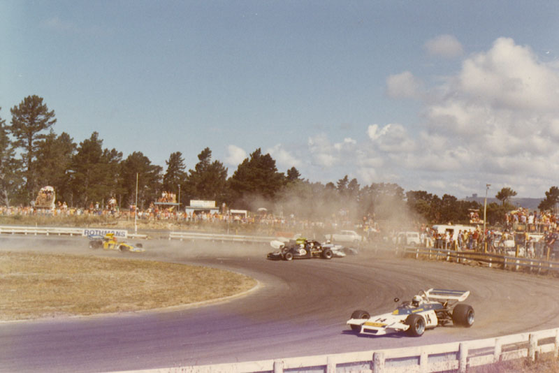 Pukekohe played host to the 1973 New Zealand Grand Prix, and the big field featured a star-studded cast of the worlds best Formula 5000 teams. The McRae GM1 was the car to have in 1972/73, and apart from McRae himself, Alan Rollinson, Evan Noyes, and Dexter Dunlop were all entered in customer cars. Australian driver/engineer Frank Matich appeared in a car of his own design, the Match A50, while Max Stewart, Warwick Brown, and Kevin Bartlett all had the latest wedge-shaped Lola 300, with its radical hip-mounted radiators, breaking away from the traditional nose mounted radiator design. John McCormack was entered in the impressive Australian built Elfin MR5.