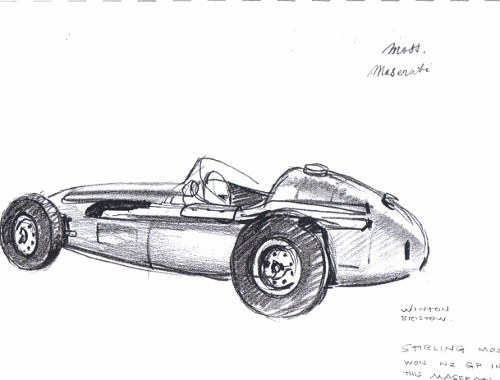 Moss- Maserati at Ardmore - 1956** Sketch by Win Bristow - notes at the bottom by Win Moss Maserati at top added by Ed Dowding - these from his copies of the series of sketches - put on TRS before on another thread