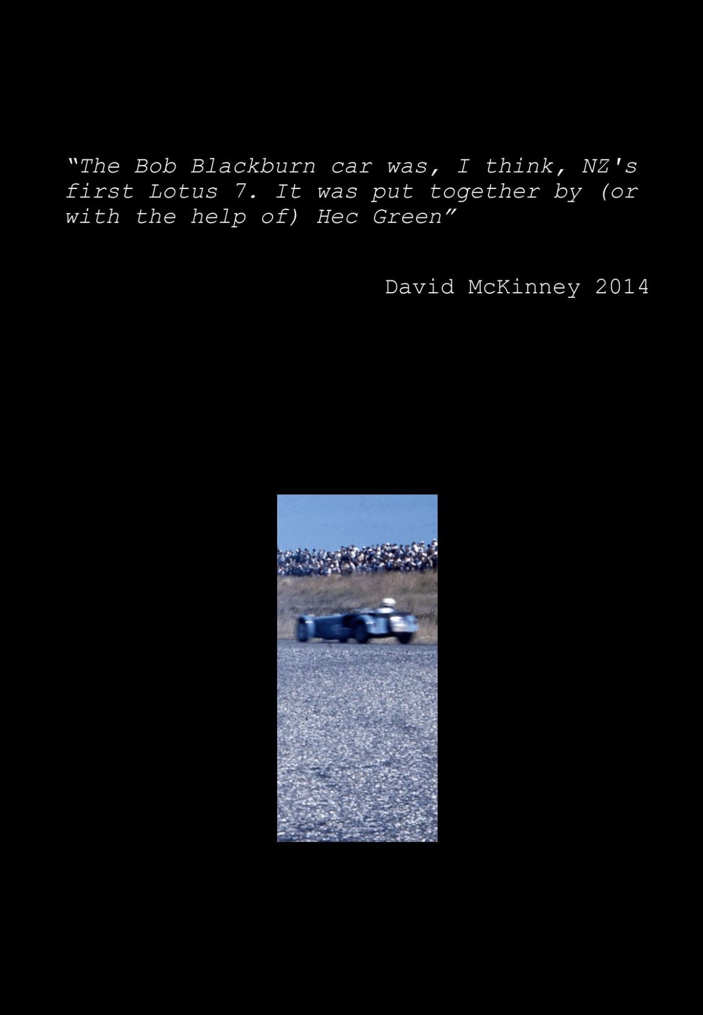 Bob Dawes raced the car with the Sports Car Enthusiasts Club based in Palmerston North and mainly raced at Manfield - the SCEC. He competed with people like Austin Healey guy Jim Reece in a Mark 3 Sprite and others.