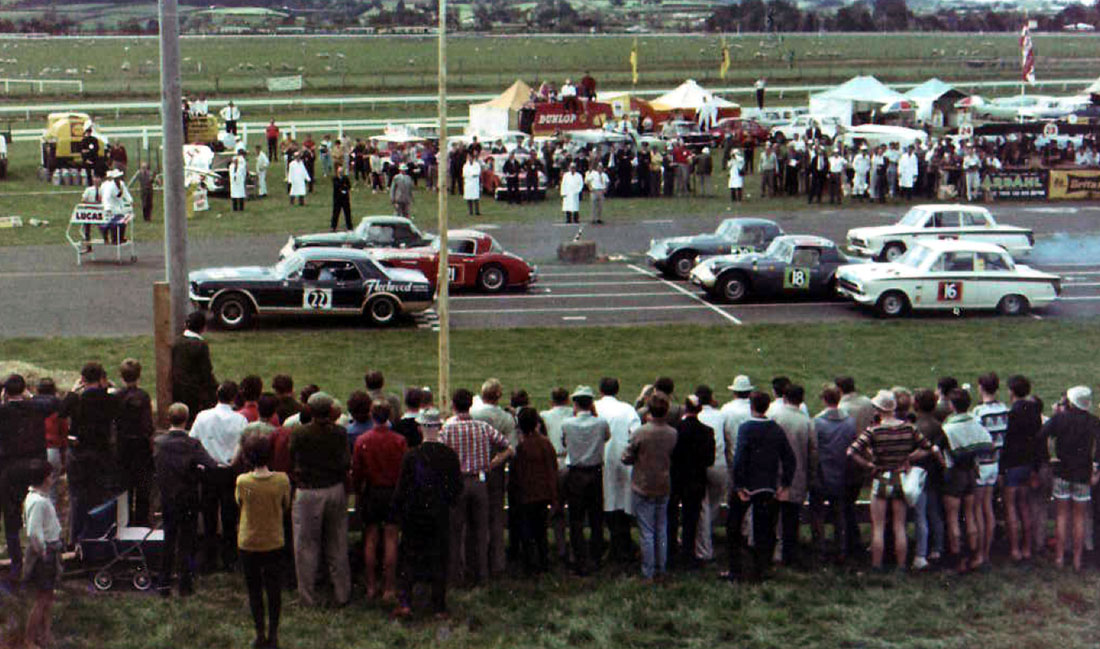 In the Daimler in company with others at Pukekohe in 1964 - from the Ardmore - Pukekohe Reunion Book of 1983.