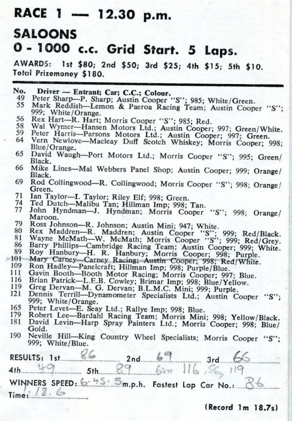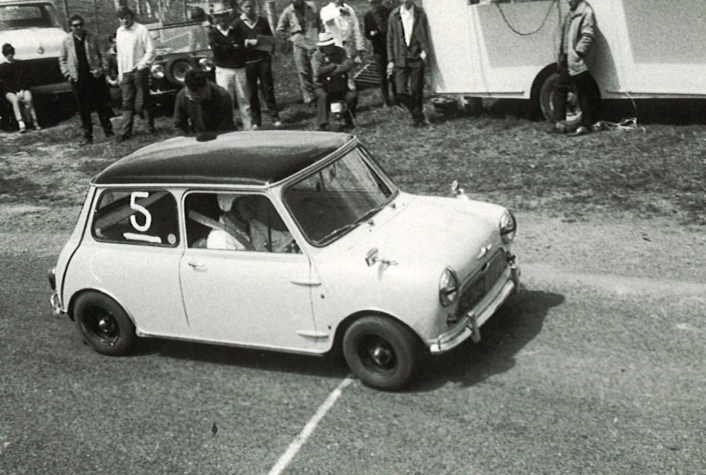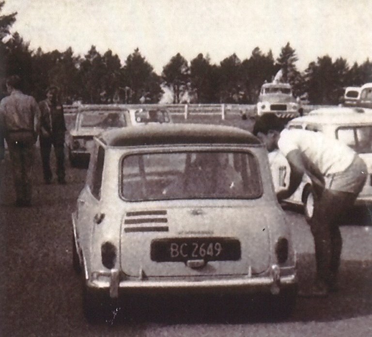 Seen before but my 3rd car second Mini, unmodified apart from the 4.5 inch Dunlop reverse rim Cooper wheels, needed to be reversed to fit over the drum brakes, Coopers had Disc's. here at Woodhill for a Grass Sprint with Northern Sports Car Club in 1971 [ Tom Grace's farm - well known in NSCC circles, both the farm and the farmer Tom ].