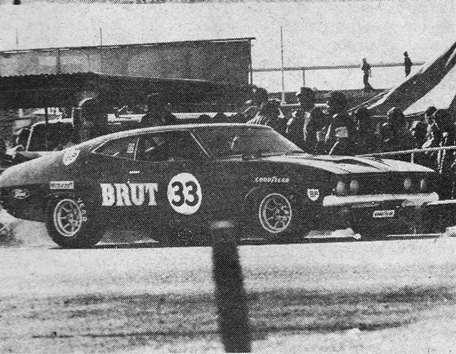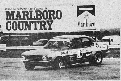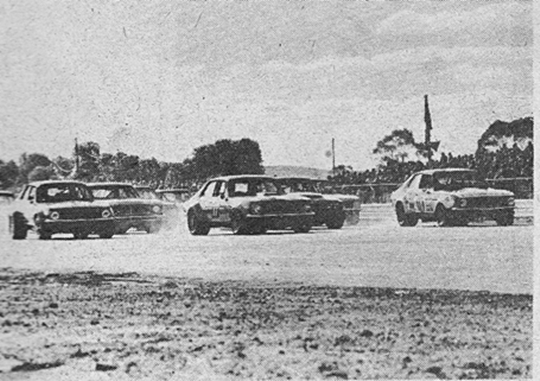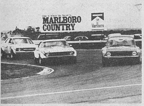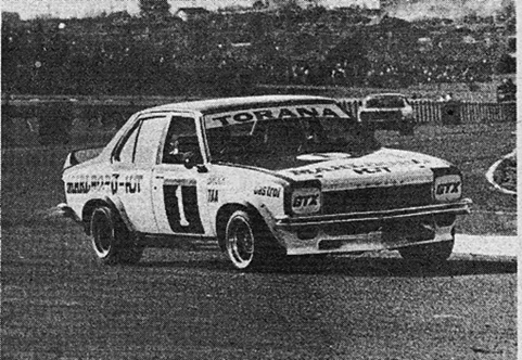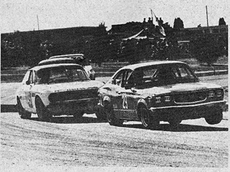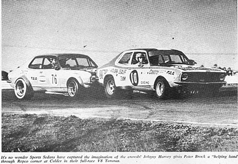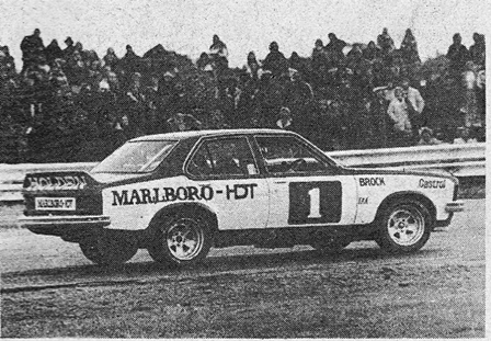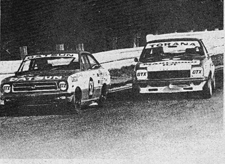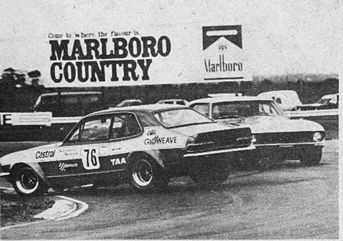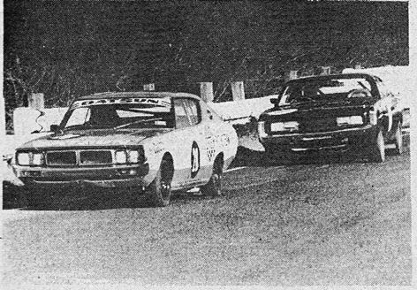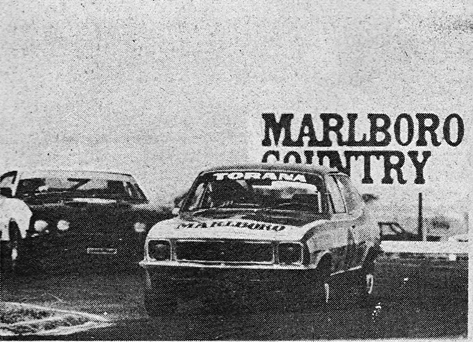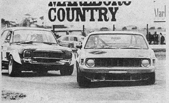 Brocks 6 cylinder Torana in front of Moffats V8 Falcon
