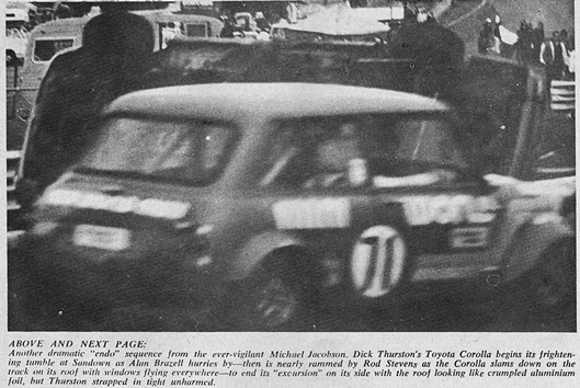 Dick Thurstons Corolla on its way over as Alan Brazell go past, Sandown