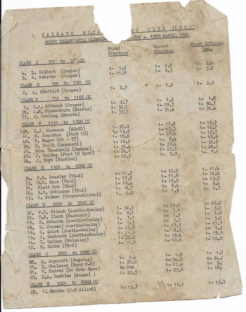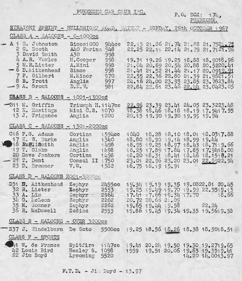 The Entry List for the Pukekohe Car Club Straight Sprints at Hullbright Road, I believe the road was used also for Hillclimbs using more of the road in the Hills.