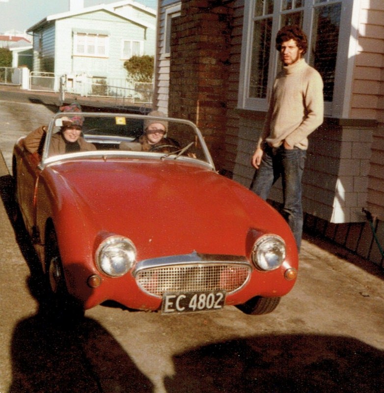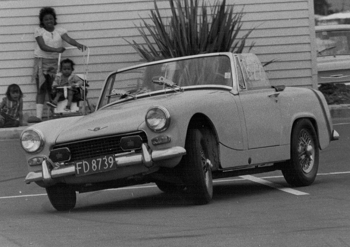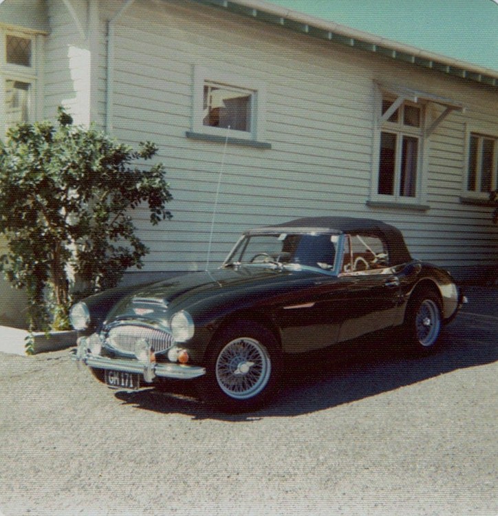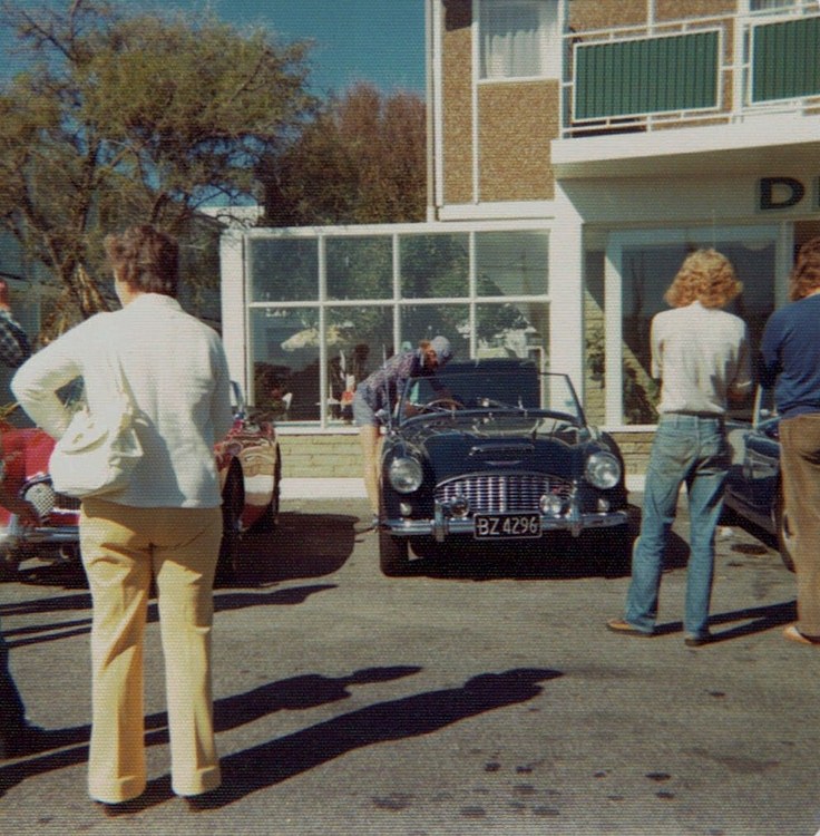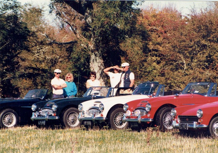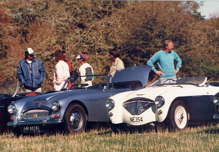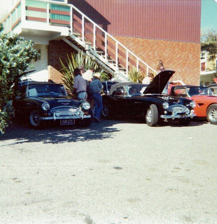 BSA Healey and Sunbeam, a mixed lot at AHCCNZ events, as many Healey owners had cars that were not mobile, two of the guys in the photo actually jointly owned a Big Healey at the time that was more or less a chassis with some parts. BSA owned by Lyle Chambers [ sitting on Bill Povey's Healey beside Bill's wife Kathy ] and the Sunbeam owned by Richard Leaper [ peering into the Healey ] Bill also looking into his Healey ( passenger side ), Judy Leaper sitting on the Sunbeam.