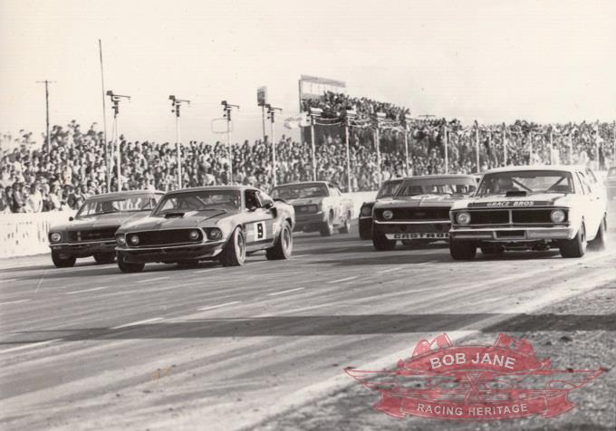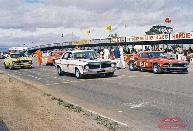 Oran Park, 1972. The final round of the '72 Australian Touring Car Championship, and the final ATCC race held under the outgoing Improved Production rules. Here Allan Moffat and Pete Geoghegan lead the field away at the start. Bob Jane already had the championship wrapped up, having won four of the first seven races. His biggest challenger once again was Allan Moffat, but Moffats chances went down the gurgler following a protest by Jane at the Warwick Farm round, where the two had come together during an attempt to pass by Moffat which spun Jane down the order.