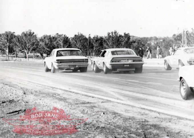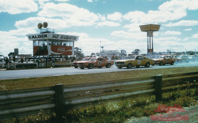 Blast-off at Calder, in a Sports Sedan race in either late 1972 or early '73. Furthest from camera appears to be Bob's Repco V8 Torana, which is probably being driven by John Harvey. Then there are the Jane Camaro and Beechey Monaro. In behind appears to be the beautiful John Bassett Escort.