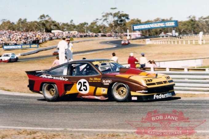 Drag race here between Allan Moffats RS3100 Capri, and Bob Janes V8 Repco Torana. Moffats Capri was one of the works 1974 ETCC quad-cam V6 cars. Moffat raced it in 1975 and 1976. 1976 was the first year CAMS held an Australian championship for the Sports Sedan category, and Moffat used this car, along with the DeKon Chevy Monza pictured above, to win the championship. This car is now owned by Gordon Burr in New Zealand, and is raced a couple of times a year quite enthusiastically.