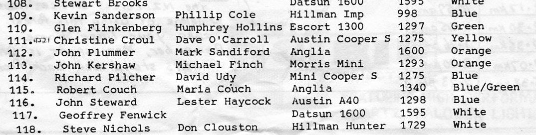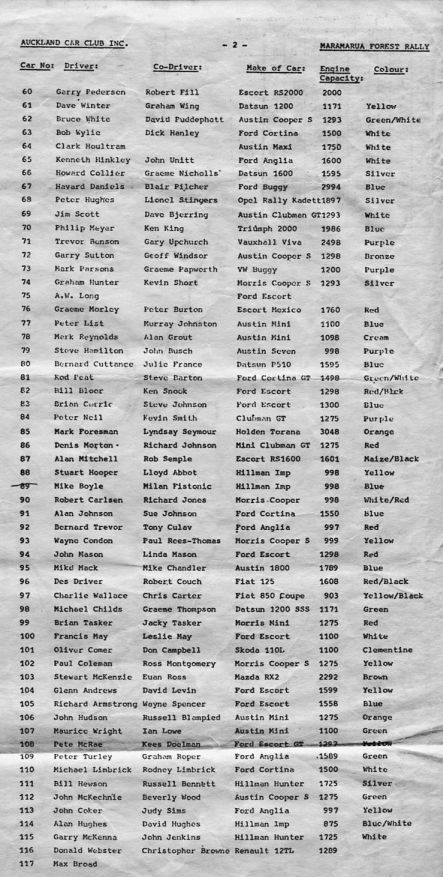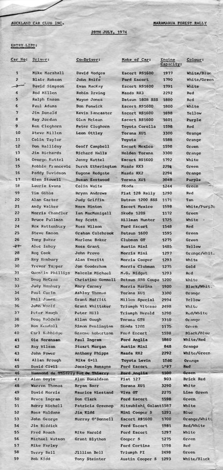 This is the entry list for the 1974 Maramarua Rally. You are there at number 112 and I'm there co-driving for Mike Boyle in the ex-Peter Levet Hillman Imp at 89.