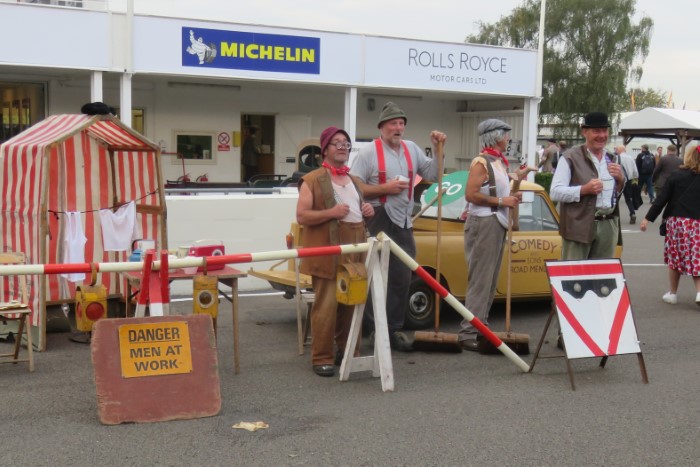One aspect of Goodwood that is appreciated by visitors but often overlooked by journalists, is the humour that is up front. In addition to these 'workmen' (regulars) we have spivs being chased by cops, a couple of guys with step ladders who appear in the stand, with a supervisor, and pretend to clean a non-existent window, a posse of St Trinian's schoolgirls with school Ma'am and so on. Love it!