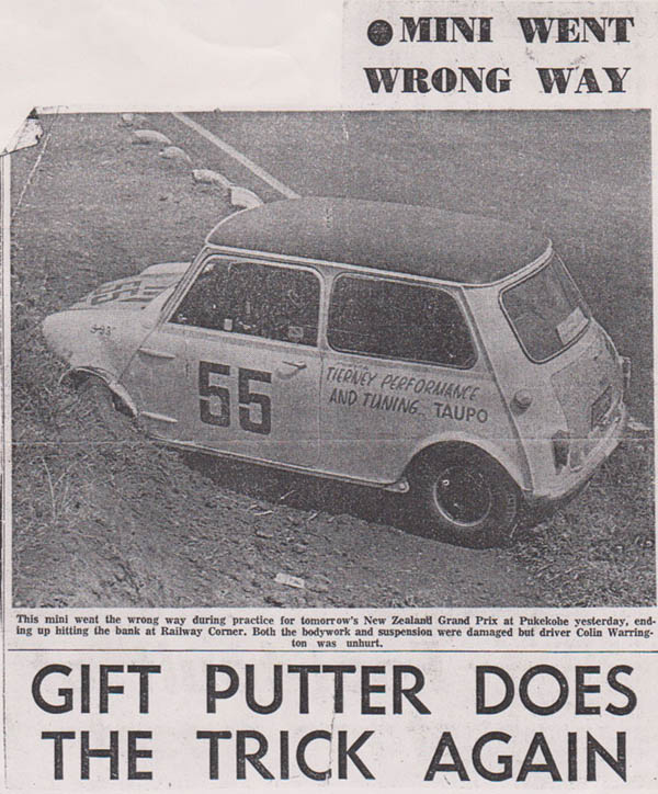 He may have struggled to get the magazine coverage of the guys in front of him, but he did get some media time for all the wrong reasons when, at Pukekohe, Roy Harringtons Imp blew its engine to pieces during practice at the NZIGP meeting, and Colin, following closely behind, slipped on the oil and slammed the bank heavily. Although the newspaper clipping said he was unhurt, in fact, he'd damaged his back.