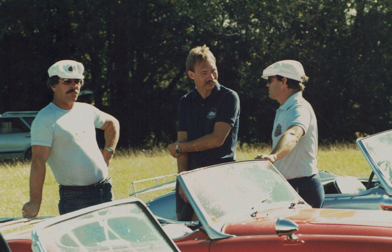 **** Des Spillane's white 100 in the background, his brother Jim's two tone 3000 in the foreground, Jim doing some cleaning for the Concours' and Chris Whites Sprite background right..