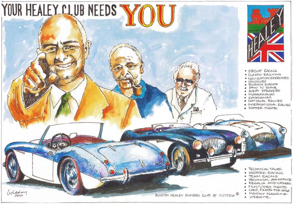 from Healey Club of Vistoria, using a UK Healey Cluib badge , a poster with Donald Geoff and Bic [ Brian ] Healey .