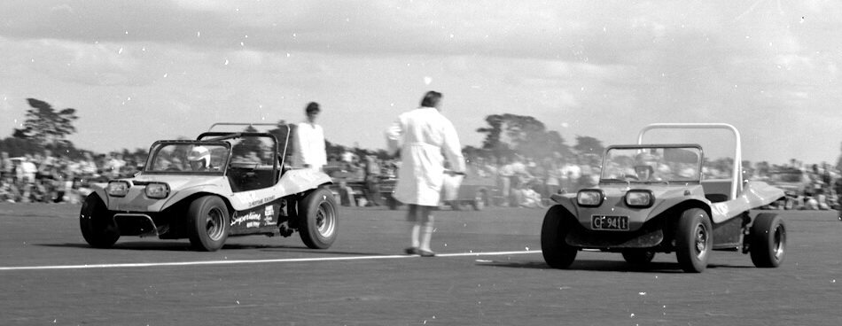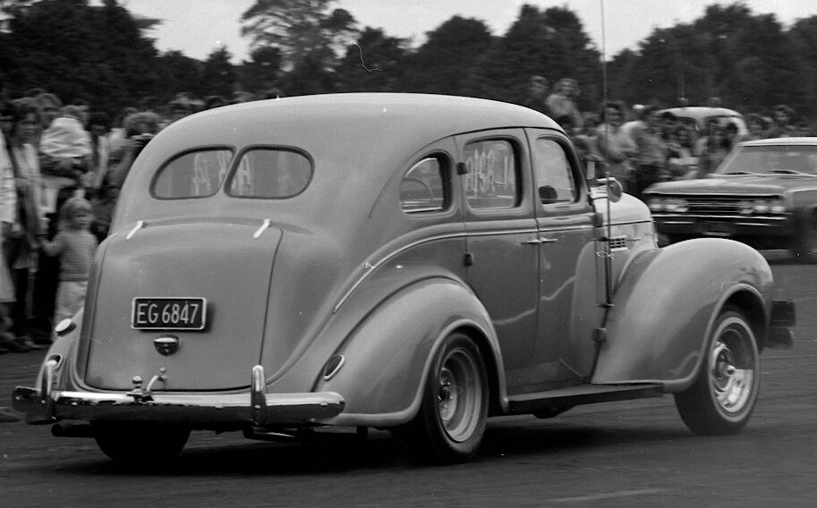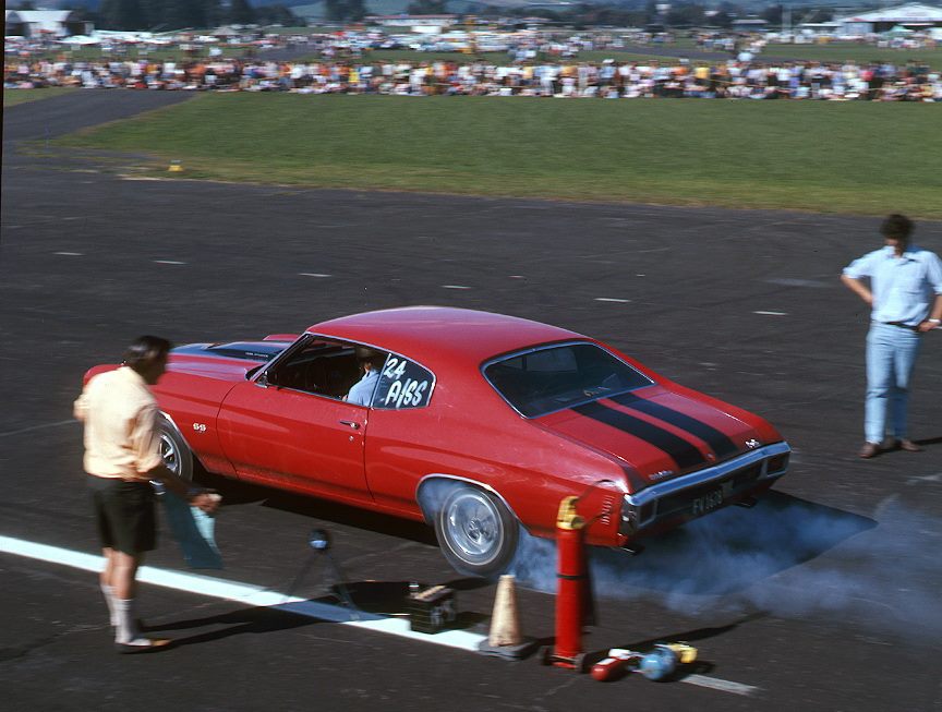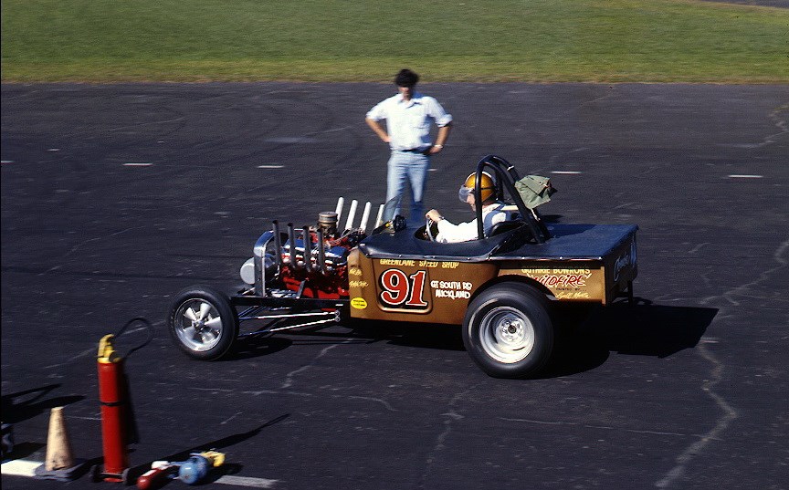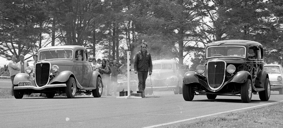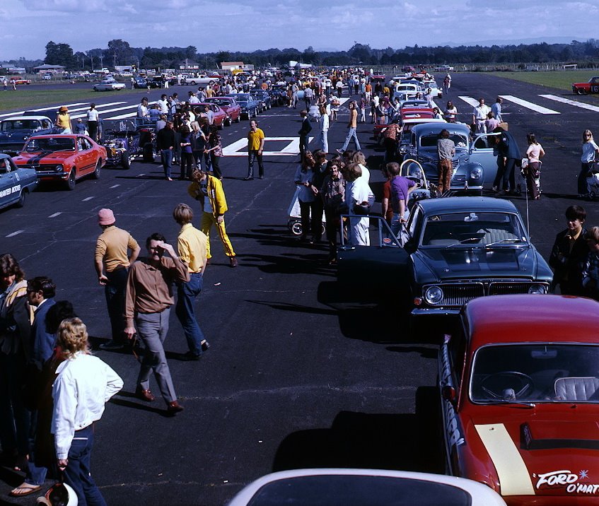 Bay Rodders ran a winter series of about 6 Drag Race meets a year on the back straight of old Baypark starting at the camp ground end. In the late 70's early 80's I attended just about every event. That's me in the yellow Mustang picking on a Jappa, LOL. NOTE: Great crowd control, talk about get up close. Dale M