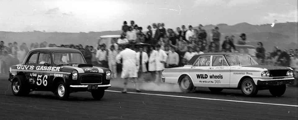 Guy Lim in the mad little V8 propelled Prefect versus Colin Prast in the Fairlane. The Fairlane ran a 427.