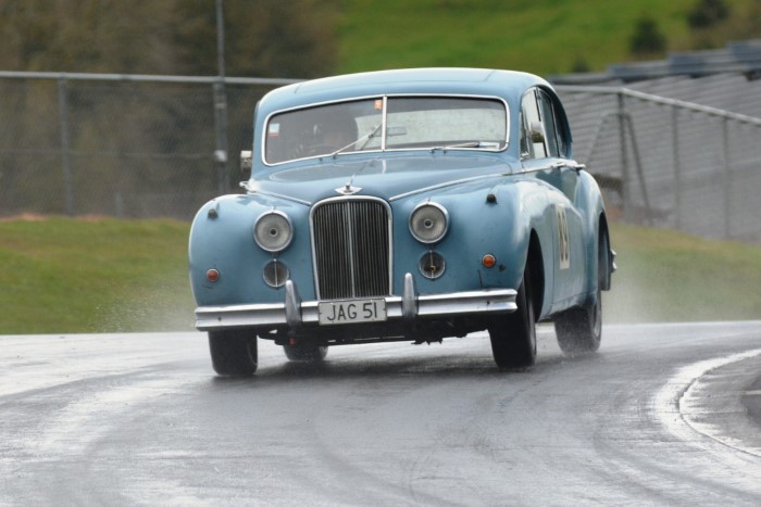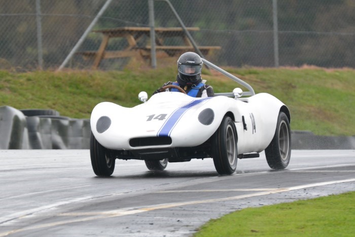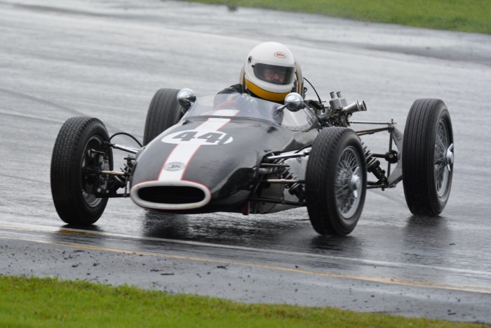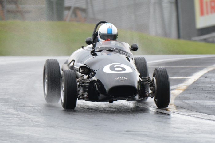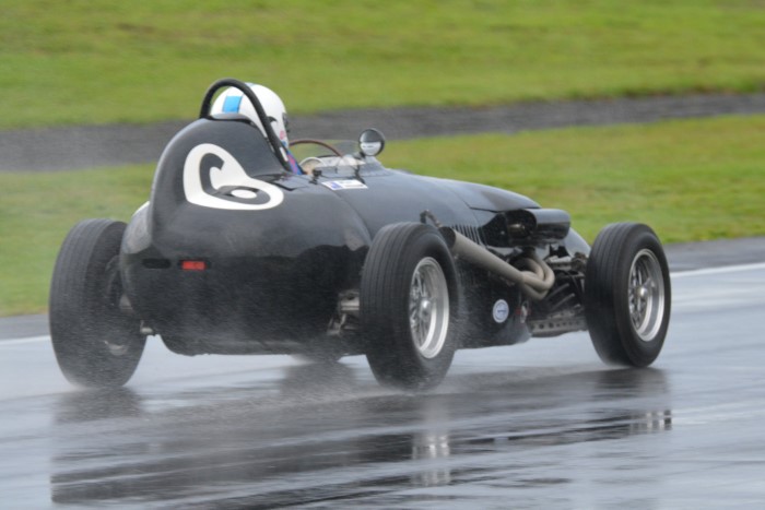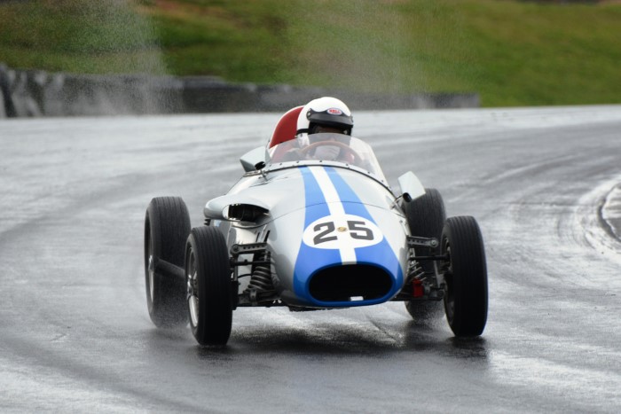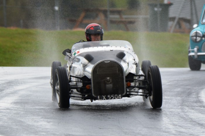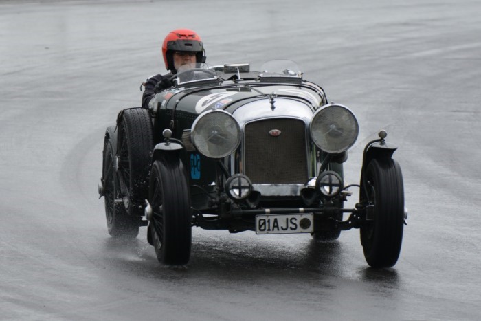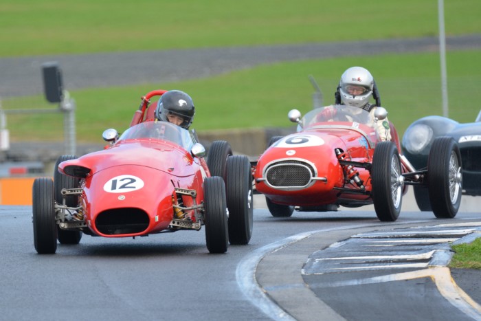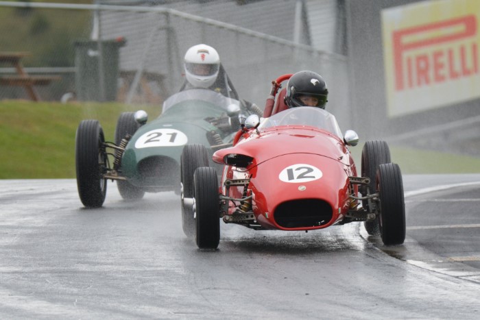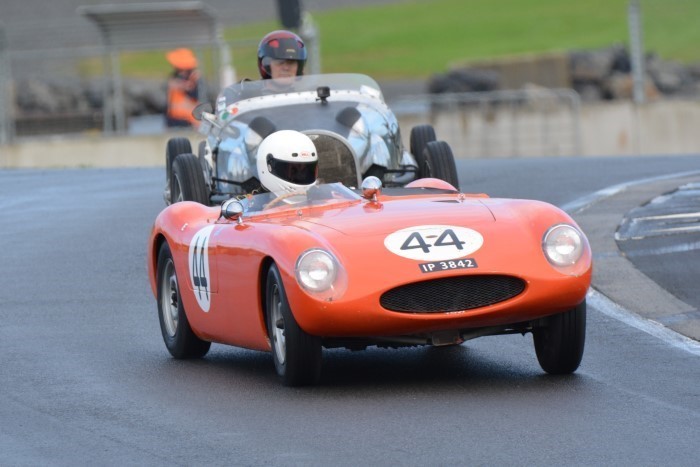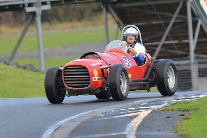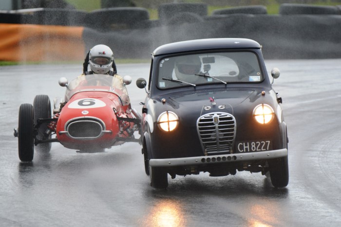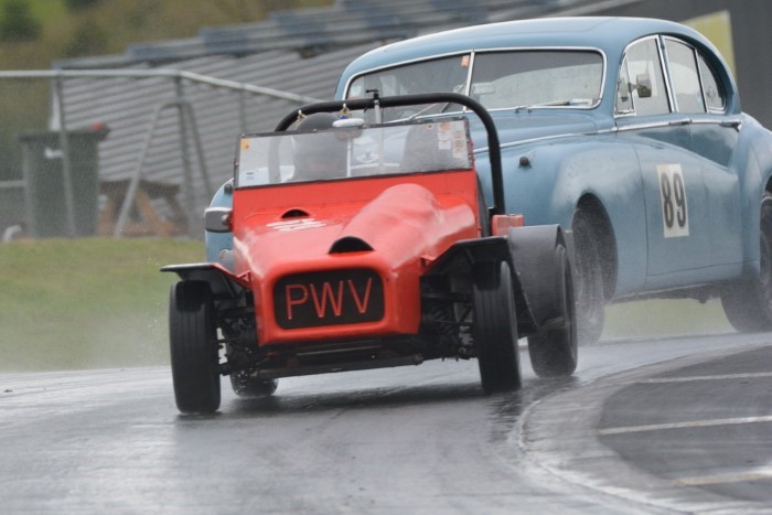 The mixed grid provided some interesting car combinations. How often has an Austin A30, even a Speedwell one, had a Formula Junior Jocko filling its mirrors? This is now Tim's cover photograph on his Facebook page. He emerged from practice with a shredded fanbelt so VCC Scrutineer, Kevin, was busy replacing it afterwards, so that Tim could race again.