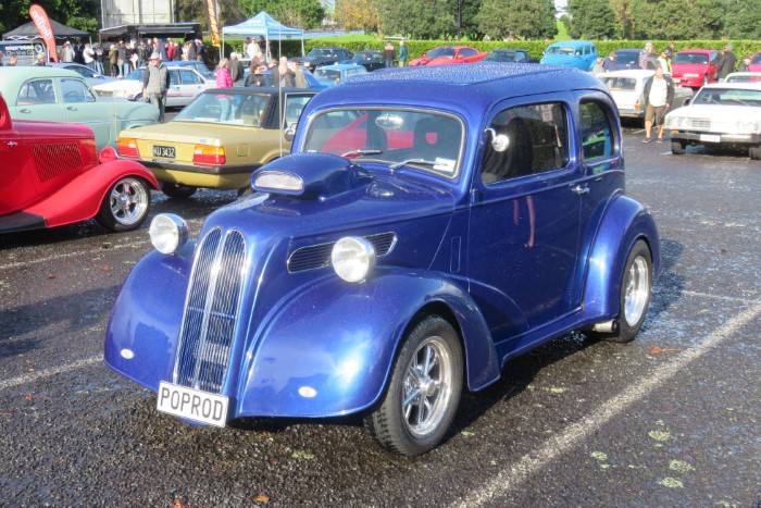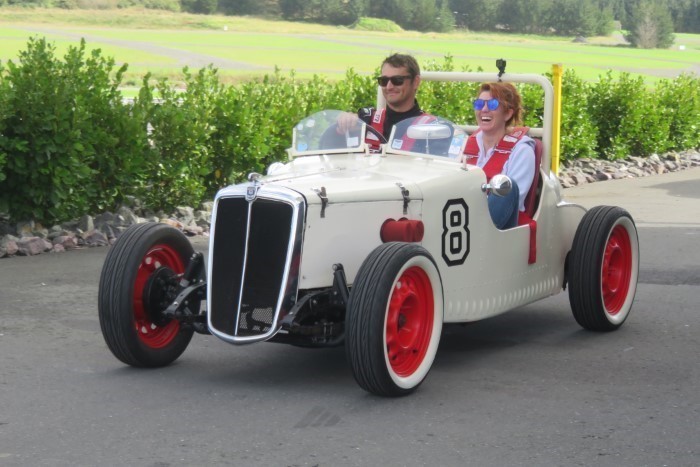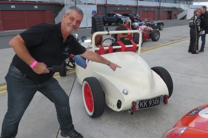 JT points out the Morris Minor bonnet at the rear of Bevan's Morris 8 Special!