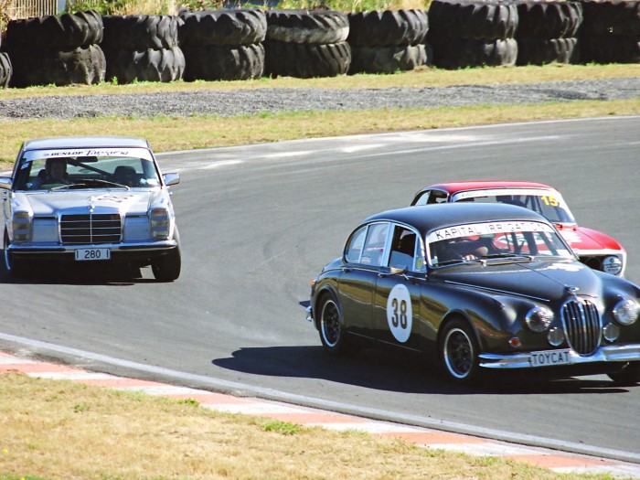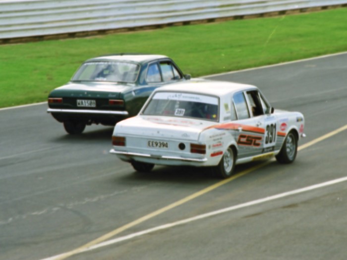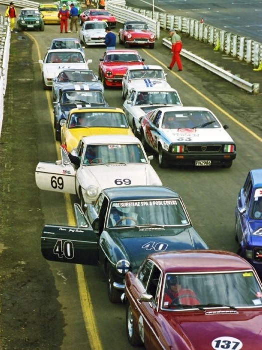 Then things went to custard. Nose to tail into the Pukekohe hairpin, obviously every one hard on the brakes, coming down from over 110mph (or almost 120mph in my case!) but someone (in a red MGB sports) lost it on the exit, so there was a nose to tail crunch, which didn't exactly help my fibreglass bodywork as I hit Dave Mallin's steel bodied MGB.
