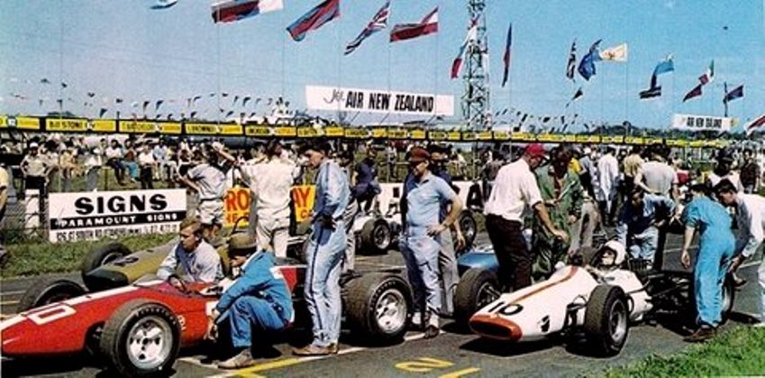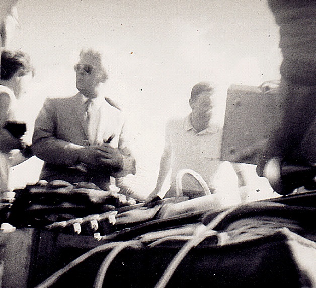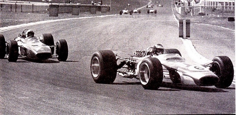 After the grand event of the previous year we were anxious to see Bruce McLaren beat the opposition once again. He had Phil Hill for a team mate and their Coopers were trying to be competitive on new 15 inch Firestone tyres which Bruce had to use when the cars had been designed to run on 13 inch tyres. They struggled in the morning heat races when Hill's Cooper went off approaching the hairpin and Bruce was lucky when his car spun, clipped an ambulance and ended in the creek at the esses. For the Grand Prix, Bruce borrowed Phil Hill's Cooper # 48.(His previous year winning car). He started well and was behind Jim Clark as we watched come round the Elbow Corner on lap 2 and I remember the track announcer saying " I see why they call Jimmy Clark the Flying Scotsman " as they went down the back straight and then there was silence as I think Bruce's Cooper had the same problem as Phil had earlier and did not stop as it should have and ran into the back of Jim Clark's Lotus at the entrance to the hairpin. It was such a shame to have the two top drivers out before the race had barely begun. Later my friend and I were standing opposite the pits and just as the photo shows, Colin Chapman was not looking pleased. They had come a long way and wanted to put on a good show for the crowd. Graham Hill took advantage of the situation and drove his Brabham to win the race.