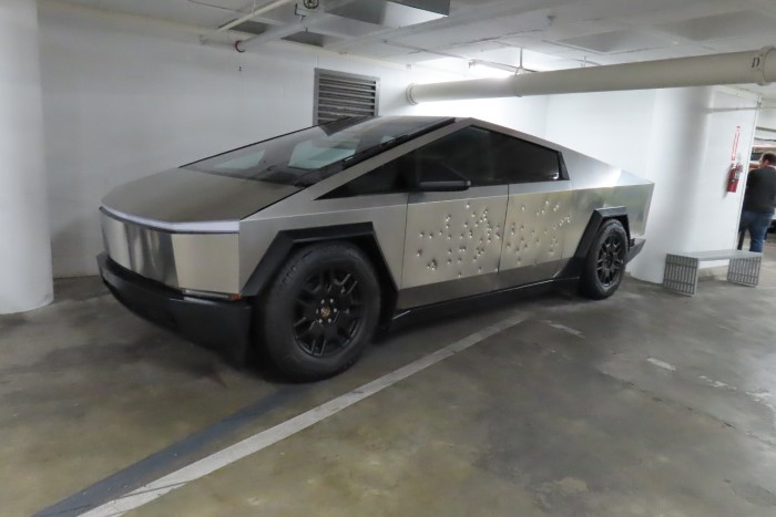 I always thought the Tesla Cbertruck was a joke with a temporary body just for the prototype. I didn't realise that they'd actually sell them looking so plug ugly. I saw three or four in LA. Quite why this has bullet holes I have no idea.