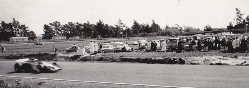 This shows the scene shortly after the Thomasen crash as Graham McRae comes by in his FM 2 Begg-Chevrolet.