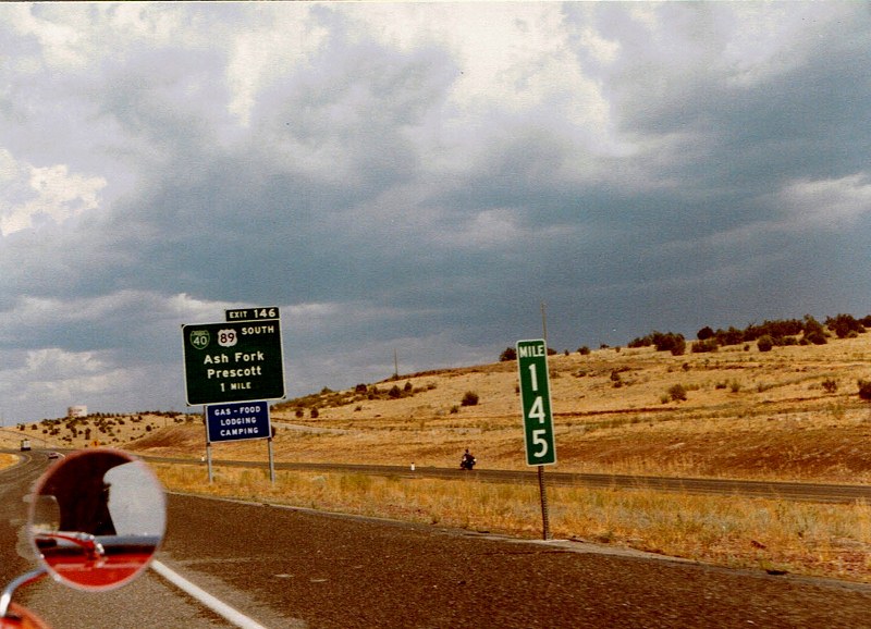 Road sign seen from a Healey, at the Junction of Interstate 40 and Highway 89, which we went on to [ part of Historic Route 66 at this stage